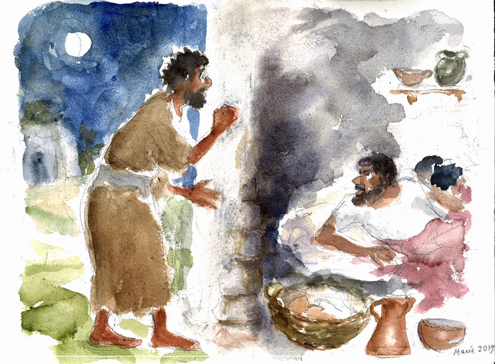 Poi disse loro: «Se uno di voi ha un amico e a mezzanotte va da lui a dirgli: “Amico, prestami tre pani, perché è giunto da me un amico da un viaggio e non ho nulla da offrirgli”; e se quello dall’interno gli risponde: “Non m’importunare, la porta è già chiusa, io e i miei bambini siamo a letto, non posso alzarmi per darti i pani”, vi dico che, anche se non si alzerà a darglieli perché è suo amico, almeno per la sua invadenza si alzerà a dargliene quanti gliene occorrono.