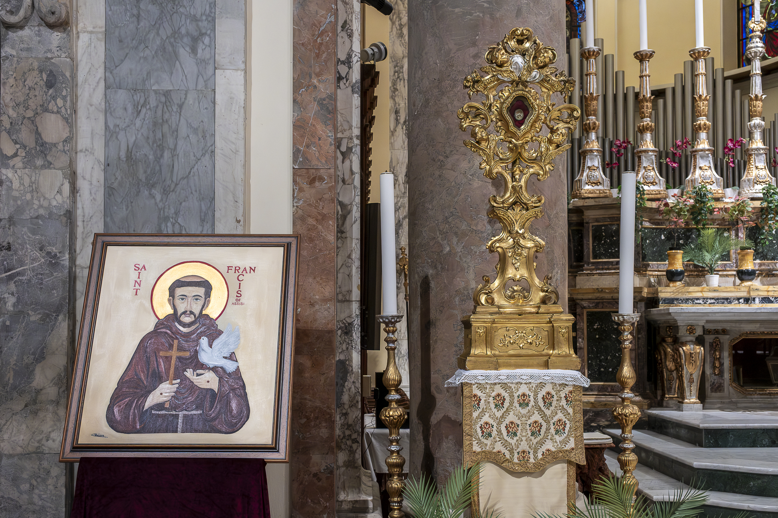 Sul presbiterio brillava la preziosissima reliquia, segno della presenza viva del Santo nel cuore di Livorno. Accanto ad essa, un quadro raffigurante il poverello di Assisi, realizzato da Caterina Ascione.