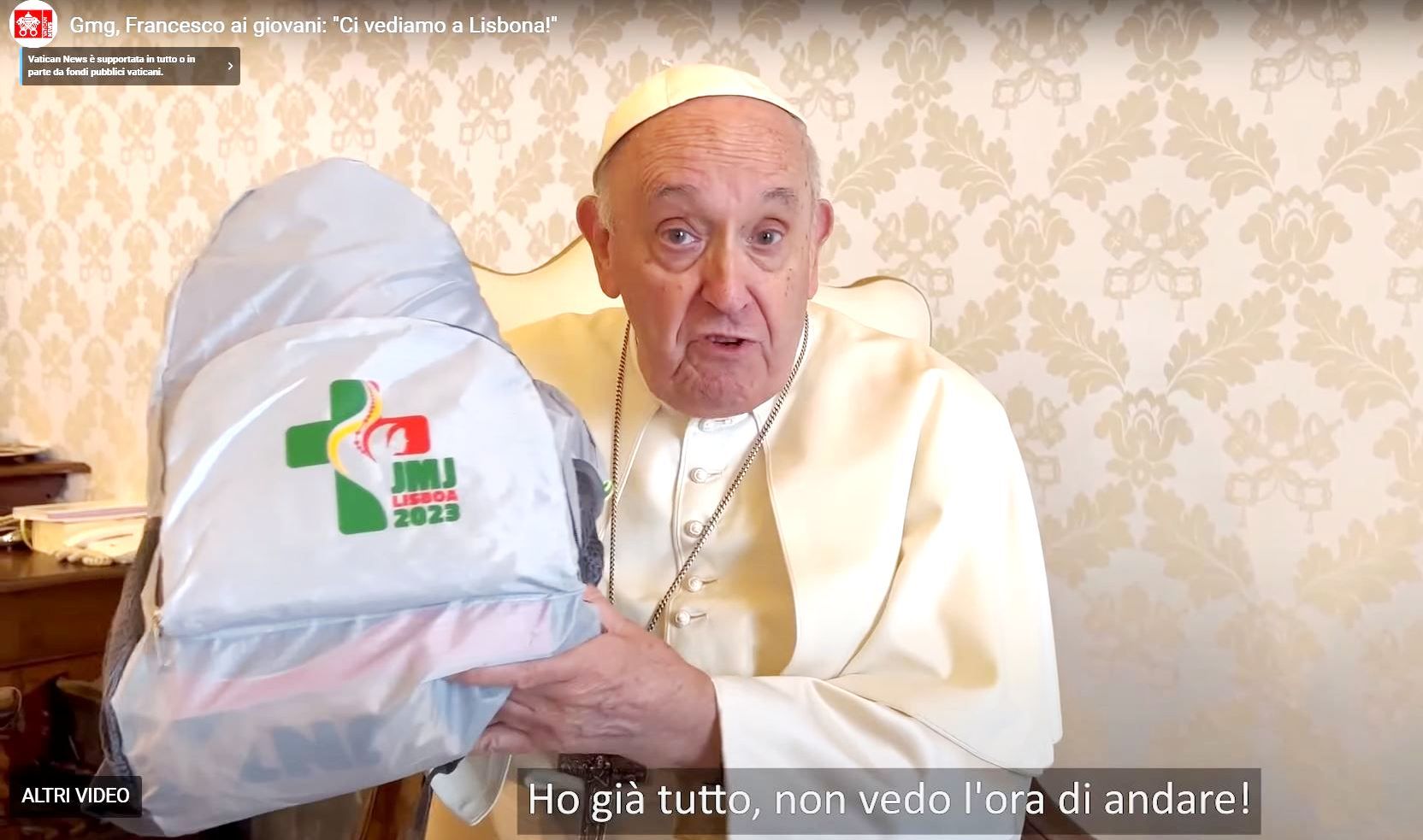 Poi, mostrando il kit delle pellegrino della Gmg 2023, aggiunge: “Non vedo l’ora, io sono già pronto”.