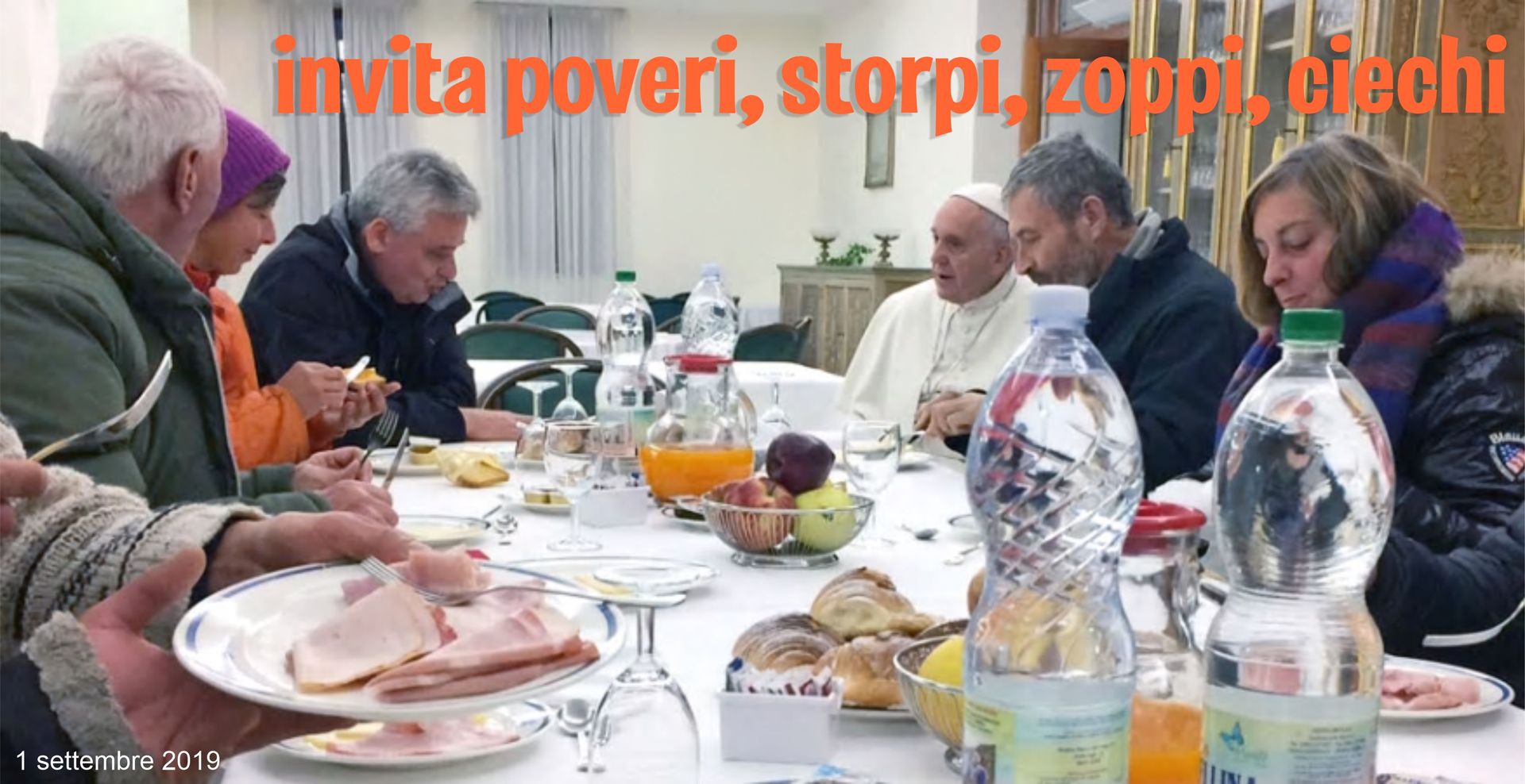 non hanno da ricambiartiLa prospettiva che Gesù ci offre nel racconto della parabola e nell’invito che ne consegue e quello di sedersi a tavola con i poveri, storpi, zoppi, ciechi nella totale gratuità. Stare insieme alla stessa tavola significa mettersi allo stesso livello, togliere di mezzo le separazioni, rendere possibile la comunicazione, perché i poveri, coloro che in qualche modo sono gli emarginati (non sempre privi di cose) hanno qualcosa da dirci, ci offrono un punto di vista del mondo (e del vangelo) totalmente nuovo.C’è un servizio di carità da offrire ai poveri, un impegno di solidarietà e di comunione, su questo la Chiesa è stata maestra al mondo intero. Attenzione però, non è una azione umanitaria né filantropica. Nell’impegno di carità c’è un sottile sentimento di appagamento e la soddisfazione nell’aiutare, donare, elargire … rimanendo però a quel primo posto di colui che offre. I poveri non hanno bisogno di elemosina per poi tornare da dove sono venuti, mentre siamo noi ad avere la necessità di mangiare allo stesso piatto; abbiamo bisogno della comunione con loro, di imparare da loro la lezione del vangelo. Nella Storia della Salvezza e nel Vangelo i poveri (gli anawim) sono i depositari del rapporto autentico con Dio; più che una dimensione sociale sono una categoria teologica, sono una Verità proprio perché priva di orpelli e sovrastrutture. Con gli ultimi è possibile recuperare il senso autentico della realtà per ripartire con entusiasmo e ritrovare la gioia (il banchetto) della vita. Ecco il significato dell’invito finale: “Amico, vieni più avanti!”