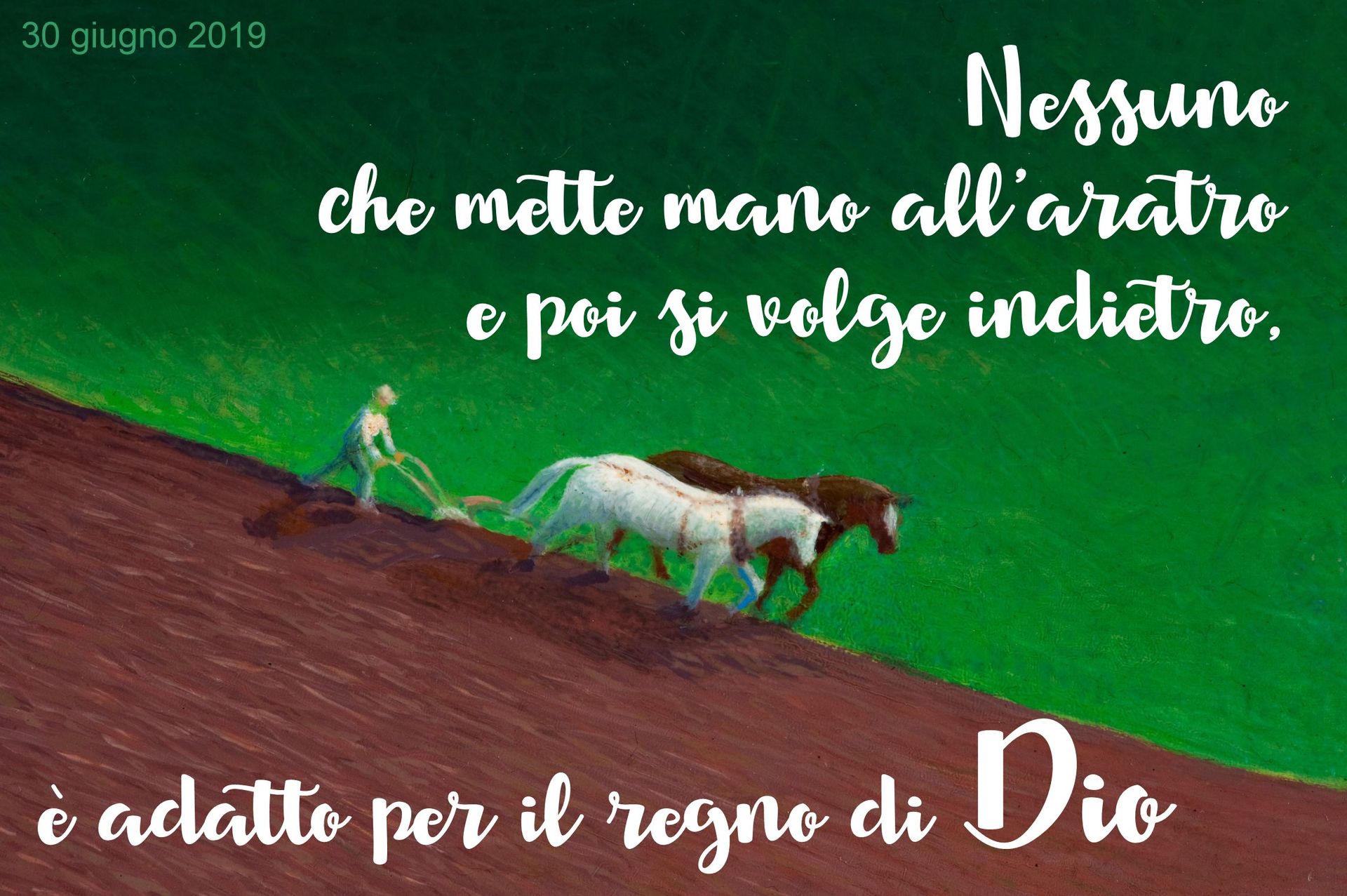 Mentre stavano compiendosi i giorni in cui sarebbe stato elevato in alto, Gesù prese la ferma decisione di mettersi in cammino verso Gerusalemme e mandò messaggeri davanti a sé. Questi si incamminarono ed entrarono in un villaggio di Samaritani per preparargli l’ingresso. Ma essi non vollero riceverlo, perché era chiaramente in cammino verso Gerusalemme. Quando videro ciò, i discepoli Giacomo e Giovanni dissero: «Signore, vuoi che diciamo che scenda un fuoco dal cielo e li consumi?». Si voltò e li rimproverò. E si misero in cammino verso un altro villaggio.Mentre camminavano per la strada, un tale gli disse: «Ti seguirò dovunque tu vada». E Gesù gli rispose: «Le volpi hanno le loro tane e gli uccelli del cielo i loro nidi, ma il Figlio dell’uomo non ha dove posare il capo». A un altro disse: «Seguimi». E costui rispose: «Signore, permettimi di andare prima a seppellire mio padre». Gli replicò: «Lascia che i morti seppelliscano i loro morti; tu invece va’ e annuncia il regno di Dio». Un altro disse: «Ti seguirò, Signore; prima però lascia che io mi congedi da quelli di casa mia». Ma Gesù gli rispose: «Nessuno che mette mano all’aratro e poi si volge indietro, è adatto per il regno di Dio».