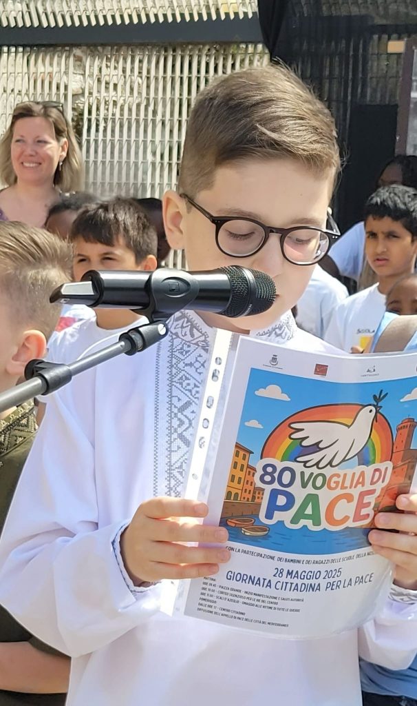 La celebrazione organizzata dalla Comunità di Sant’Egidio, in collaborazione con la Diocesi di Livorno, il Comune e l’Istoreco, dopo i saluti di Andrea Zargani per la Diocesi, che ha sottolineato “la necessità di comprendere che in questo periodo storico la cultura della Pace è tra le mani di tutti e che tutte le religioni possono dare a tale cultura vigore e forza” e da Michele Magnani, assessore con delega alle politiche giovanili per il Comune di Livorno, è stata introdotta da Ilaria Mucci della Comunità di Sant’Egidio: “E’ importante promuovere la pace a partire dai più piccoli”, tenendo presente che “non è giusto che nei conflitti, in ogni conflitto, ovunque esso sia, siano i bambini a dover soffrire di più per tutte le conseguente che le guerre portano” ed “è bello vedere quanti sono i bambini e gli alunni intervenuti oggi in questa giornata, segno di un desiderio di pace sempre crescente”. Le ha fatto eco la Dirigente Scolastica Cecilia Semplici “Educare alla pace è importante e si può costruire nelle classi a partire da ciascuno di noi”.