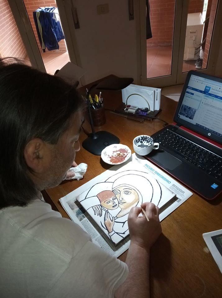 L’ho disegnata mentre coccola il Bambino tra le sue braccia: “guancia a guancia” per richiamare la tenerezza; “occhi grandi” che contemplano l’amore del suo cuore; “bocca piccola” nel custodire il silenzio, ma soprattutto sguardo intenso d’amore. Lo sguardo di Maria verso il bambino è lo sguardo dell’innamorata. Chiamerei questa icona: icona dell’innamoramento. Maria è “cotta” del suo bambino, è “cotta di Dio”. Il suo sguardo d’amore rende il mese di maggio il mese più bello: dopo il lungo e rigido inverno finalmente uno sguardo caloroso.