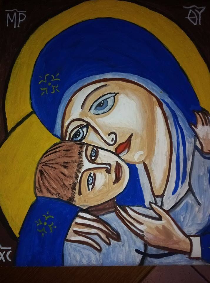 L’ho disegnata mentre coccola il Bambino tra le sue braccia: “guancia a guancia” per richiamare la tenerezza; “occhi grandi” che contemplano l’amore del suo cuore; “bocca piccola” nel custodire il silenzio, ma soprattutto sguardo intenso d’amore. Lo sguardo di Maria verso il bambino è lo sguardo dell’innamorata. Chiamerei questa icona: icona dell’innamoramento. Maria è “cotta” del suo bambino, è “cotta di Dio”. Il suo sguardo d’amore rende il mese di maggio il mese più bello: dopo il lungo e rigido inverno finalmente uno sguardo caloroso.