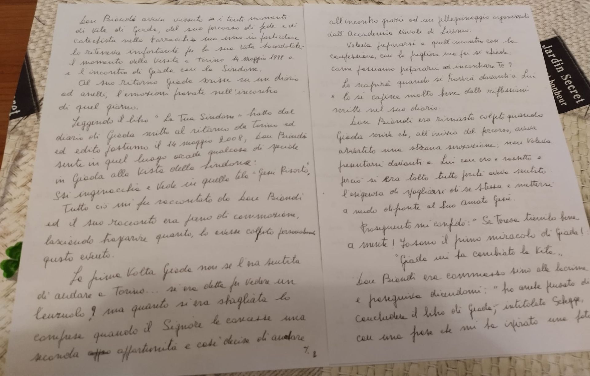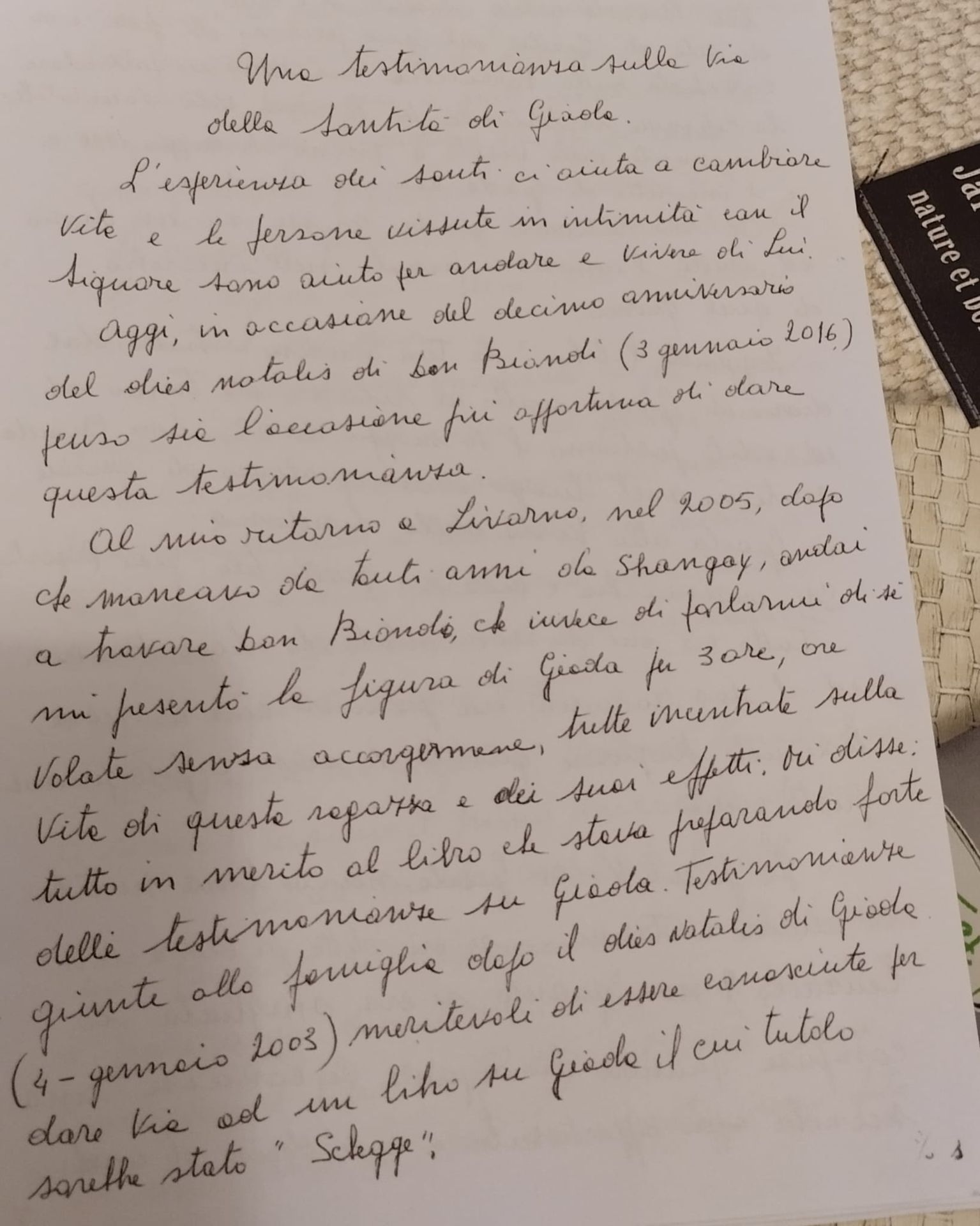 Ecco il testo: “Una testimonianza sulla via della santità di Giada. L’esperienza dei santi ci aiuta a cambiare vita e le persone vissute in intimità con il Signore sono aiuto per andare a vivere con Lui. Oggi, in occasione del decimo anniversario del dies natalis di don Biondi (3 gennaio 2016), penso sia l’occasione più opportuna di dare questa testimonianza. Al mio ritorno a Livorno, nel 2005, dopo che mancavo da tanti anni da Shangay, andai a trovare don Biondi che, invece di parlarmi di sé mi presentò la figura di Giada per tre ore, ore volate senza accorgermene, tutte incentrate sulla vita di questa ragazza e dei suoi effetti. Mi disse tutto in merito al libro che stava preparando forte delle testimonianze su Giada. Testimonianze giunte alla famiglia dopo il dies natalis di Giada ( 4 gennaio 2003 ), meritevoli di essere conosciute per dare via ad un libro su Giada il cui titolo sarebbe stato “Schegge”! Don Biondi aveva vissuto i tanti momenti di vita di Giada, del suo percorso di fede e di catechista nella parrocchia ma uno in particolare lo riteneva importante per la sua vita sacerdotale: il momento della visita a Torino il 14 maggio 1998. e l’incontro di Giada con la Sindone. Al suo ritorno Giada scrisse, su un diario ad anelli, le emozioni provate nell’incontro di quel giorno. Leggendo il libro ” La Tua Sindone “, tratto dal diario di Giada scritto al ritorno da Torino ed edito postumo il 14 maggio 2008 , don Biondi sente che in quel luogo accade qualcosa di speciale in Giada alla vista della Sindone: si inginocchia e vede in quella tela ” Gesù Risorto “.Tutto ciò mi fu raccontato da don Biondi ed il suo racconto era pieno di commozione, lasciando trasparire quanto, lo avesse colpito questo evento. La prima volta Giada non se l’era sentita di andare a Torino …. si era detta per vedere un lenzuolo? Ma quanto si era sbagliata lo comprese quando il Signore le concesse una seconda opportunità e così decise di andare all’incontro grazie ad un pellegrinaggio organizzato dall’Accademia Navale di Livorno. Voleva prepararsi a quell’incontro con la confessione, con la preghiera ma poi si chiede: come possiamo prepararci ad incontrate Te? Lo scoprirà quando si troverà davanti a Lui e lo si capisce molto bene dalle riflessioni scritte nel suo diario. Don Biondi era rimasto anche colpito quando Giada scrive che, all’inizio del percorso, aveva avvertito una strana sensazione: non voleva presentarsi davanti a Lui con oro e rossetto e perciò si era tolto tutto perché aveva sentito l’esigenza di spogliarsi di sé stessa e mettersi a nudo difronte al Suo amato Gesù. Proseguendo mi confidò: ” Suor Teresa tienilo bene a mente! Io sono il primo miracolo di Giada! Giada mi ha cambiato la vita”. Don Biondi era commosso fino alle lacrime e proseguiva dicendomi: ” ho anche pensato di concludere il libro di Giada, intitolato Schegge , con una frase che mi ha ispirato una foto di Giada stessa e mi mostrò la foto di Giada con il bastone in mano e proseguì e questa è la frase: ” Giada… alzati, prendi il tuo bastone, dammi la tua mano e andiamo ad annunziare che Cristo e risorto … che Cristo è Amore, gioia …Speranza !” Questa foto si trova pagina 125 del libro Schegge e sulla lapide di Giada che è nel camposanto di Santa Giulia di Livorno. Questa frase, così come l’ha ripetuta don Biondi , mi è rimasta nel cuore e devo dire che ha segnato anche quel momento della mia vita quale motivazione per il servizio che dovevo prestare presso la Casa Circondariale di Livorno per conto della mia Congregazione: ero stata proposta, in quel periodo, a visitare i carcerati e ad ascoltarli.