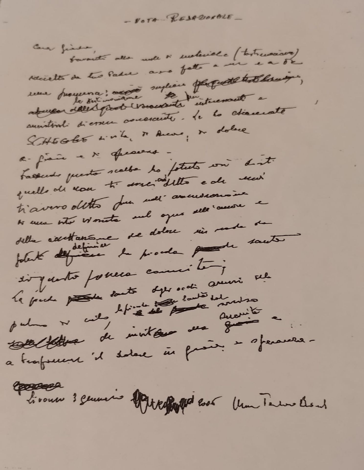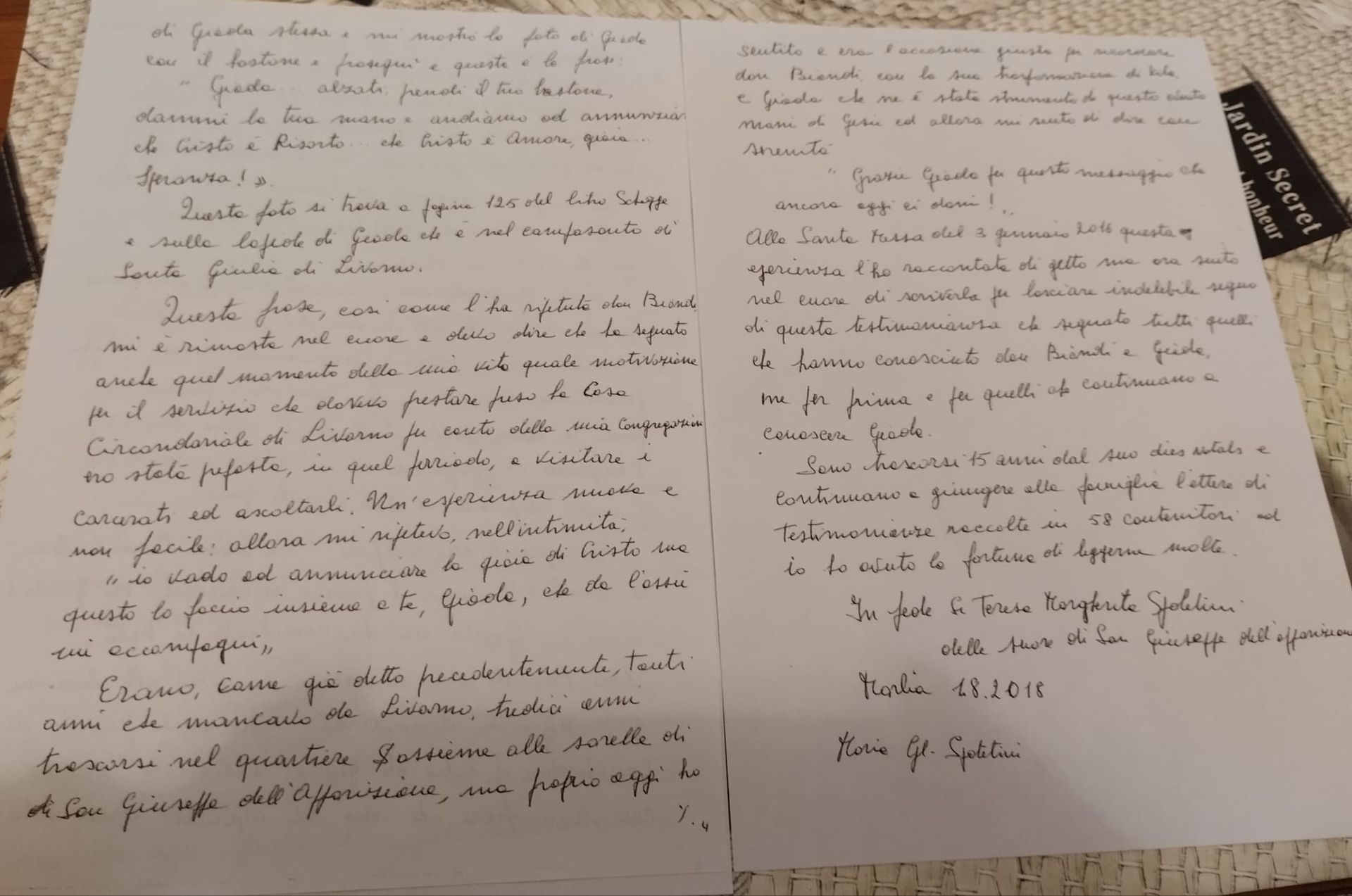 Un’esperienza nuova e non facile: allora mi ripetevo, nell’intimità, ” io vado ad annunciare la gioia di Cristo ma questo lo faccio insieme a te, Giada, che da lassù mi accompagni”. Erano, come già detto precedentemente, tanti anni che mancavo da Livorno, tredici anni trascorsi nel quartiere assieme alle sorelle di San Giuseppe dell’Apparizione, ma proprio oggi ho sentito che era l’occasione giusta per ricordare don Biondi, con la sua trasformazione di vita, e Giada che ne è stata strumento di questo evento nelle mani di Gesù ed allora mi sento di dire con serenità: ” Grazie Giada per questo messaggio che ancora oggi ci doni” Alla Santa Messa del 3 gennaio 2016 questa esperienza l’ho raccontata di getto ma ora sento nel cuore di scriverla per lasciare indelebile segno di questa testimonianza che ha segnato tutti quelli che hanno conosciuto don Biondi e Giada, me per prima e per quelli che continuano a conoscere Giada. Sono trascorsi 15 anni dal suo dies natalis e continuano a giungere alla famiglia lettere testimonianze raccolte in 58 contenitori ed io ho avuto la fortuna di leggerne tante. In fede Suor Teresa Margherita Spoletini delle Suore di San Giuseppe dell’Apparizione. Marlia 1.8.2018″ ( in foto la lettera originale). La messa si è conclusa con la canzone per Giada cantata da Loredana Contini.Il prossimo appuntamento con le testimonianze sarà domenica 4 febbraio alla parrocchia della Sacra Famiglia e per chi volesse portare un fiore a Giada, ricordo che il suo corpo riposa nel cimitero di Santa Giulia.