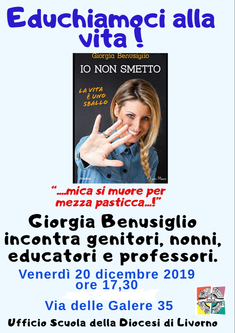 Genitori, nonni, insegnanti, catechisti, educatori e tutti coloro che hanno a che fare con i giovani sono invitati a partecipare all’incontro di Venerdì prossimo 20 Dicembre alle 17.30 nella sala del centro culturale “Ablondi” di via delle Galere 35 con la scrittrice Giorgia Benusiglio, autrice del libro “Educhiamoci alla vita. … mica si muore per mezza pasticca”, organizzato dall’ufficio scuola della Diocesi.