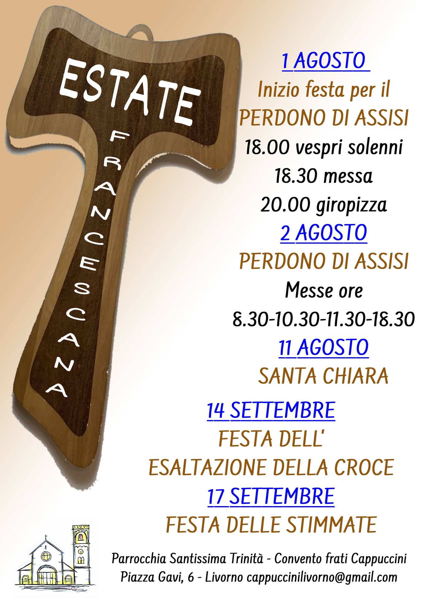 Alcuni appuntamenti nei prossimi giorni e a settembre caratterizzano l’estate francescana. Alla parrocchia della Ss. Trinità si inizia con il Perdono di Assisi, per poi proseguire con la festa di S. Chiara, l’esaltazione della croce e la ricorrenza delle stimmate. Appuntamenti significativi per chi segue la spiritualità di San Francesco, appuntamenti da poter vivere insieme, nel raccoglimento e nella preghiera alla parrocchia dei Cappuccini di Livorno, insieme ad altri fedeli seguaci del carisma del patrono d’Italia.
