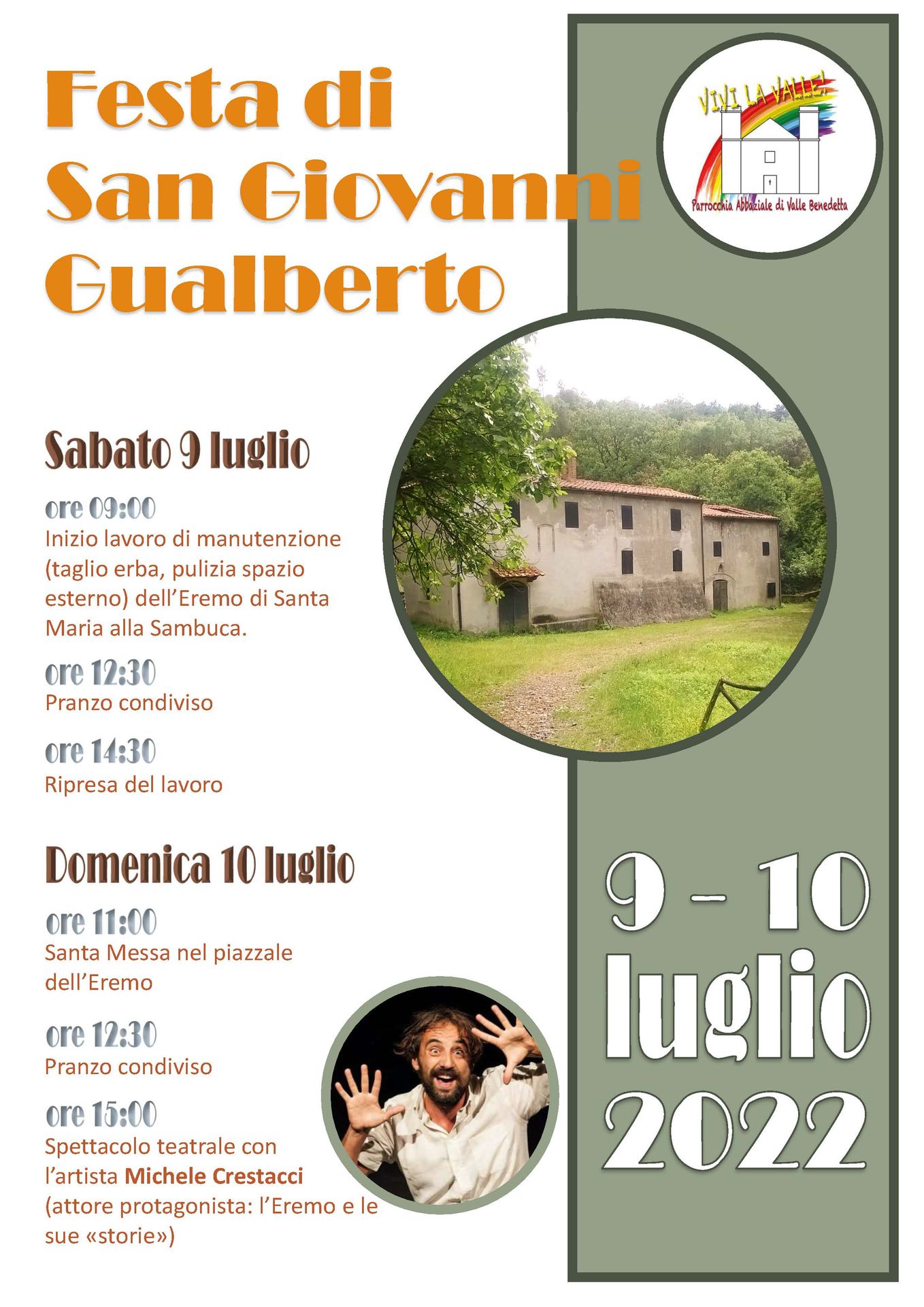 Quest’anno , sabato 9 e domenica 10 luglio, la festa della Parrocchia di S. Giovanni Gualberto di Valle Benedetta si svolgerà interamente presso l’Eremo di Santa Maria alla Sambuca. Nelle intenzioni del parroco, don Cristian Leonardelli e della comunità parrocchiale, c’è la volontà e la speranza di vedere rinascere quell’eremo che ha secoli di storia alle spalle ed è attualmente in uno stato di abbandono. Proprio nell’intenzione di coinvolgere maggiormente chi vorrà partecipare, la prima giornata sarà dedicata ai lavori di pulizia degli spazi intorno all’Eremo e pranzo condiviso; la domenica la S. Messa, a seguire il pranzo preparato da volontari della Parrocchia e nel pomeriggio uno spettacolo teatrale con Michele Crestacci (attore protagonista: l’Eremo e le sue “storie”).L’eremo che sorge tra i boschi e corsi d’acqua, può diventare un luogo di rinascita spirituale a pochi passi dalla città di Livorno ; un luogo dove a contatto stretto della natura ognuno può trascorrere delle ore o chissà, in futuro, dei giorni in cui ritrovare sé stessi per tornare alla vita di tutti i giorni rinnovati nella mente e soprattutto nello spirito.