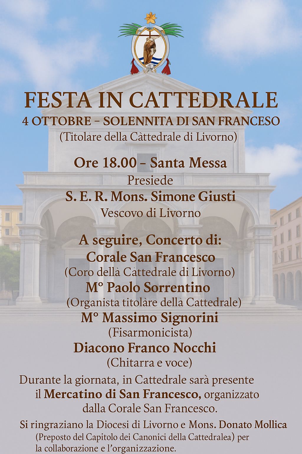 Livorno si prepara a celebrare la festa di San Francesco d’Assisi, a cui è intitolata la Cattedrale cittadina. L’appuntamento è per sabato 4 ottobre alle ore 18.00 con la Santa Messa solenne, presieduta da S. E. R. Mons. Simone Giusti, Vescovo di Livorno.