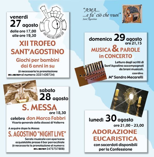 Serata in concerto con musica sacra e letture meditate, domenica 29 agosto alle 21:15, presso la chiesa di Sant’Agostino, per festeggiare la ricorrenza del Santo patrono: in programma, riflessioni su alcuni scritti filosofici e teologici della produzione di Sant’Agostino, commentati musicalmente da brani inediti per archi, fiati, coro e continuo, composti per l’occasione ed eseguiti all’organo da Sandro Mecarelli, al flauto traverso da Simone Barbieri, al violino da Chiara Caturegli, al violoncello da Anna Nosiglia e con la partecipazione del soprano Generosa Cicchetti, del mezzosoprano Rosalba Fazzi e del Coro parrocchiale di Sant’Agostino.L’ingresso è gratuito; anzi, i presenti ne saranno arricchiti dal punto di vista umano ed artistico!Un evento da non perdere