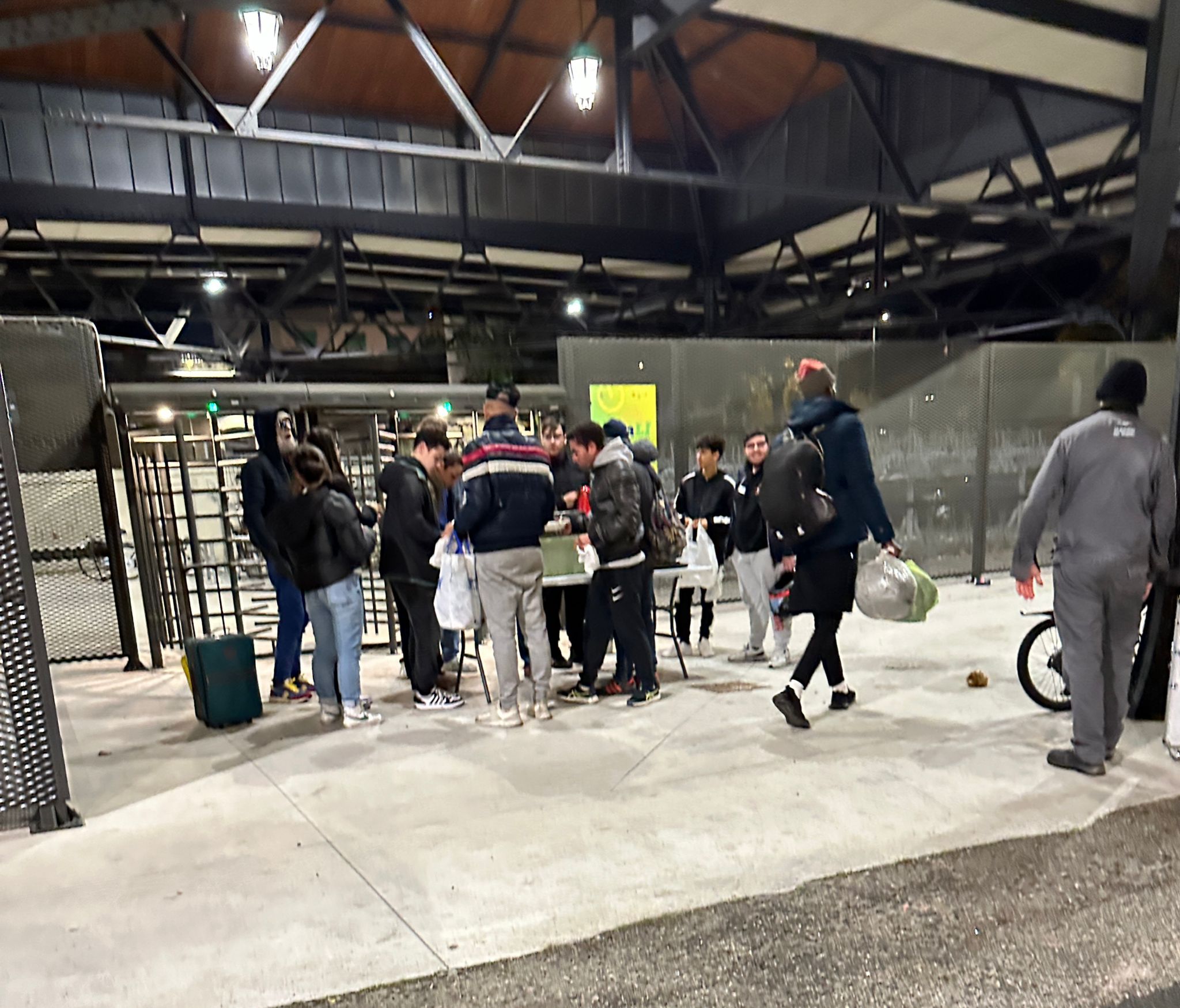 Ci sistemiamo sotto la tensostruttura vicina al parcheggio delle bici – racconta Alessio – che è un po’ più protetta e ci sono le luci; portiamo il thermos con il tè e serviamo la zuppa a chi si avvicina. Gli operatori di Caritas anche loro fanno il giro e portano cornetti, latte e altro cibo raccolto nei vari bar e pasticcerie, noi abbiamo pensato di portare qualcosa di caldo, specialmente in questi giorni invernali.
