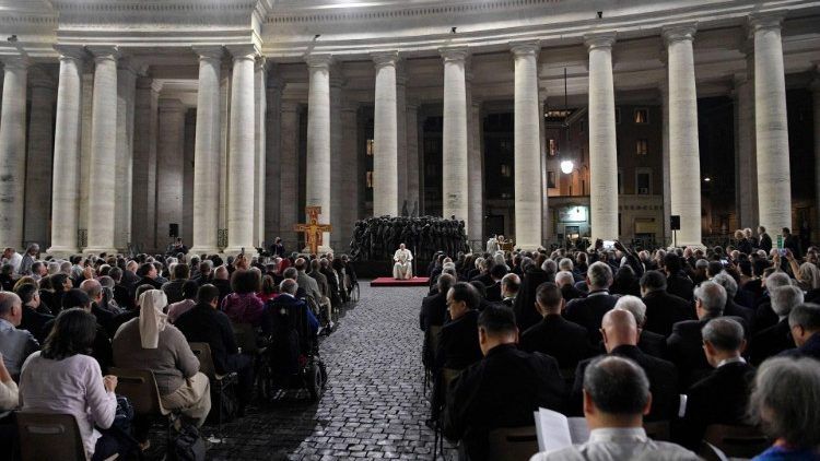 Si rendano sicure le strade percorse dai migranti, perché non cadano nelle mani delle reti criminali che su di loro speculano, e ci si impegni ad ampliare i canali migratori regolari. È questo che il Papa chiede, parlando con alle spalle Angel Unawares, la scultura che li raffigura quei migranti e rifugiati, quegli “uomini e donne di ogni età e provenienza, in mezzo a loro gli Angeli che li conducono”, che perdono la vita lungo le rotte migratorie, o che sopravvivono senza che vengano loro riconosciuti dignità e diritti. È a tutti loro, così come ai loro familiari e a chi ancora è in cammino, che va il pensiero dei partecipanti alla XVI Assemblea Ordinaria del Sinodo dei Vescovi che si ritrovano in Piazza San Pietro per un Momento di preghiera per i migranti e i rifugiati, presieduto dal Papa, la cui riflessione, partendo dalla parabola del buon samaritano, si sofferma sui pericoli delle nuove rotte migratorie “che attraversano deserti, foreste, fiumi e mari”.