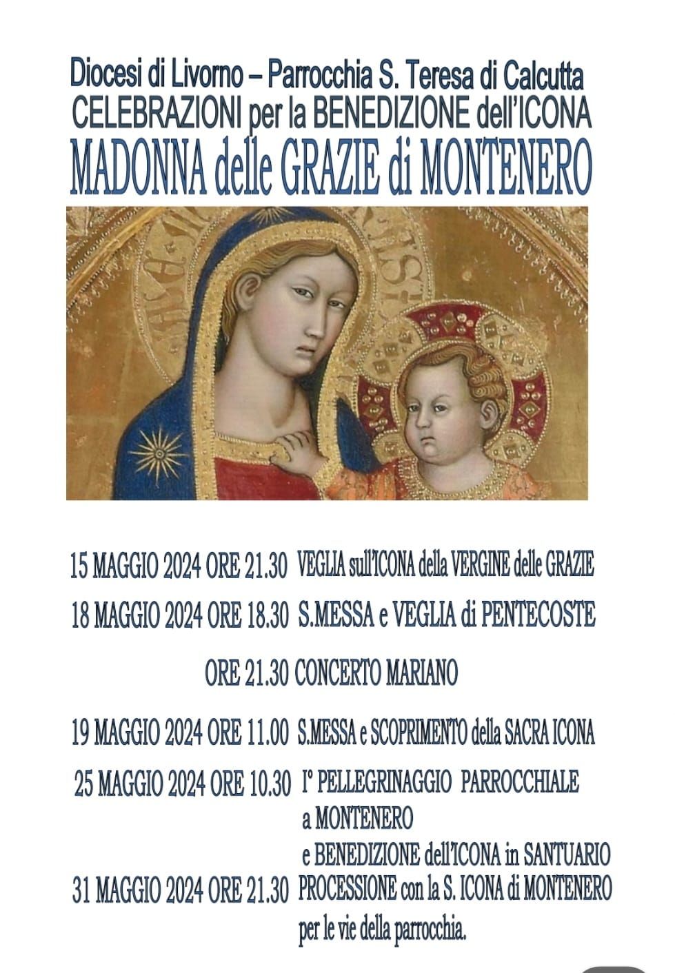 In occasione delle celebrazioni per la festa della Madonna di Montenero, alla parrocchia santa Teresa di Calcutta al borgo di Magrignano, nella sera del 15 maggio è in programma una veglia di preghiera davanti all’immagine della vergine delle grazie.
