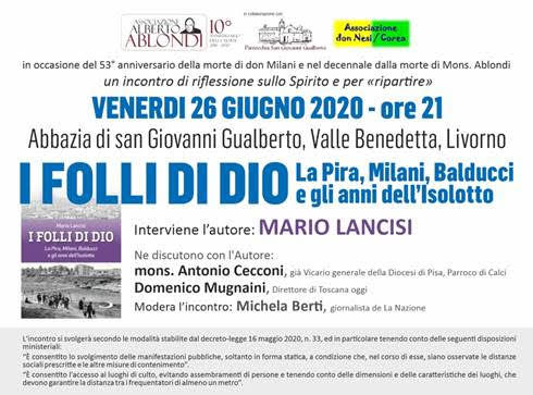 Venerdì sera a Valle Benedetta incontro con Mario Lancisi, autore del libro “Folli di Dio” (leggi https://www.www.lasettimanalivorno.it/News/Il-libro). Nell’anniversario della morte di don Milani, l’incontro organizzato dall’Associazione Alberto Ablondi, in collaborazione con la parrocchia S. Giovanni Gualberto e l’associazione don Nesi.