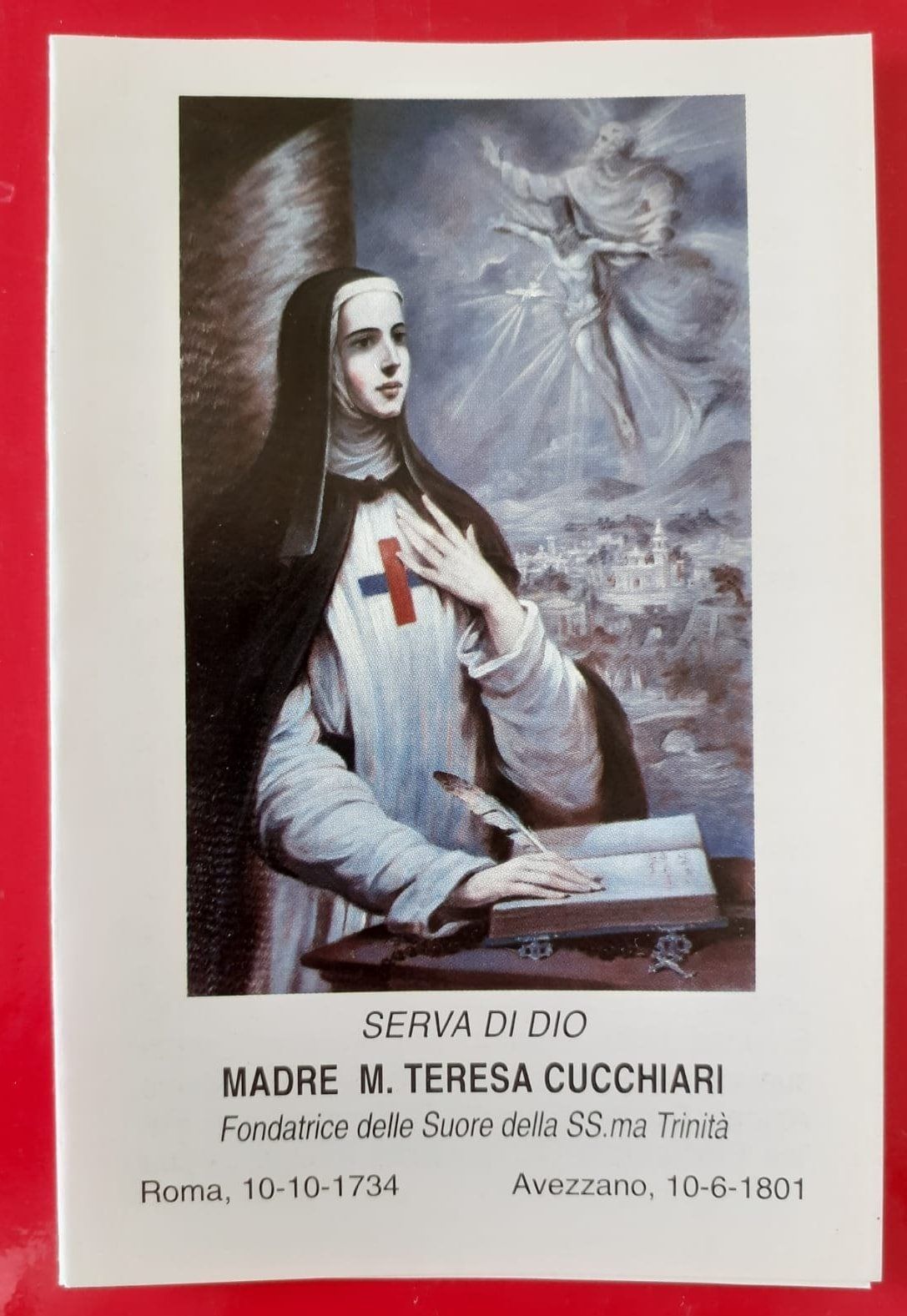 Qui Teresa ricevette i primi insegnamenti scolastici e scopre la sue attitudini di maestra che svilupperà più tardi. Nel 1760 Teresa entrò nella Chiesa di S. Carlino alle Quattro Fontane. Mentre pregava davanti al SS. Sacramento sentì di aver trovato qualcosa che appagava il suo spirito, assetato di perfezione e di santità. Si diresse ad un confessionale e vi trovò Padre Felice di Gesù e di Maria, Procuratore Generale dei Padri Trinitari, il quale da quel primo incontro con Teresa, scoprì la grandezza della sua anima il quale la preparò e la modellò per la nuova vita a cui il Signore la chiamava. Ben presto la volontà di Dio si manifestò in modo chiaro. Il Cardinale Marco Antonio Colonna espose a Padre Felice la sua preoccupazione per la mancanza della più elementare formazione delle ragazze dei suoi feudi della Marsica, in Abruzzo. I due consultarono Teresa Cucchiari. Teresa, che portava nel cuore i problemi della donna del suo tempo, accettò e fondò la Congregazione delle Maestre Pie Trinitarie.  Con altre due compagne, Marianna Rizzotto e Anna Reini, ricevette l’abito trinitario nella Chiesa di S. Carlino l’8 settembre 1762, festa della natività di Maria. Da allora si chiamerà Suor Maria Teresa della SS. Trinità. Il 25 Settembre del 1762 le prime Maestre Pie Trinitarie erano già nel primo campo di lavoro, ad Avezzano (AQ). Qui iniziò la sua missione Madre Teresa aprendo la prima scuola pubblica femminile gratuita, intitolata alla SS. Trinità per affrontare il difficile e delicato compito, dell’importanza dell’istruzione femminile in un’epoca nella quale era ancora sottovalutata. In pochi anni la congregazione si arricchì di nuove vocazioni e furono aperte scuole nella Marsina e nelle regioni limitrofe. Il 25 settembre 1765 fu aperta la scuola di Cappadocia (AQ). Altre scuole furono aperte a L’Aquila, Sulmona, Roma, Lanciano, Olevano Romano. Maria Teresa morì, in fama di santità, il 10 giugno 1801 nel convento delle suore ad Avezzano che governò instancabilmente per circa 40 anni. I suoi funerali, frequentati da un gran numero di persone, si svolsero presso la collegiata di San Bartolomeo dove le sue spoglie mortali furono depositate in via del tutto eccezionale nel sacello riservato ai sacerdoti semplici. Da 257 anni le suore Trinitarie di Roma, seguono le orme di Madre Maria Teresa. Ora sono anche in Madagascar e nelle Filippine, accolgono nelle loro scuole i ragazzi poveri per educarli e liberarli dalla schiavitù dell’analfabetismo. È in corso la causa per la beatificazione di M. Teresa Cucchiari e per essere nominata Beata occorre la prova di un miracolo. Per questo è necessario che si chieda la sua intercessione; speriamo che la diffusione e la lettura di questo libro siano propizi, così la Famiglia Trinitaria avrà una protettrice in più vicino alla gloria di Dio.