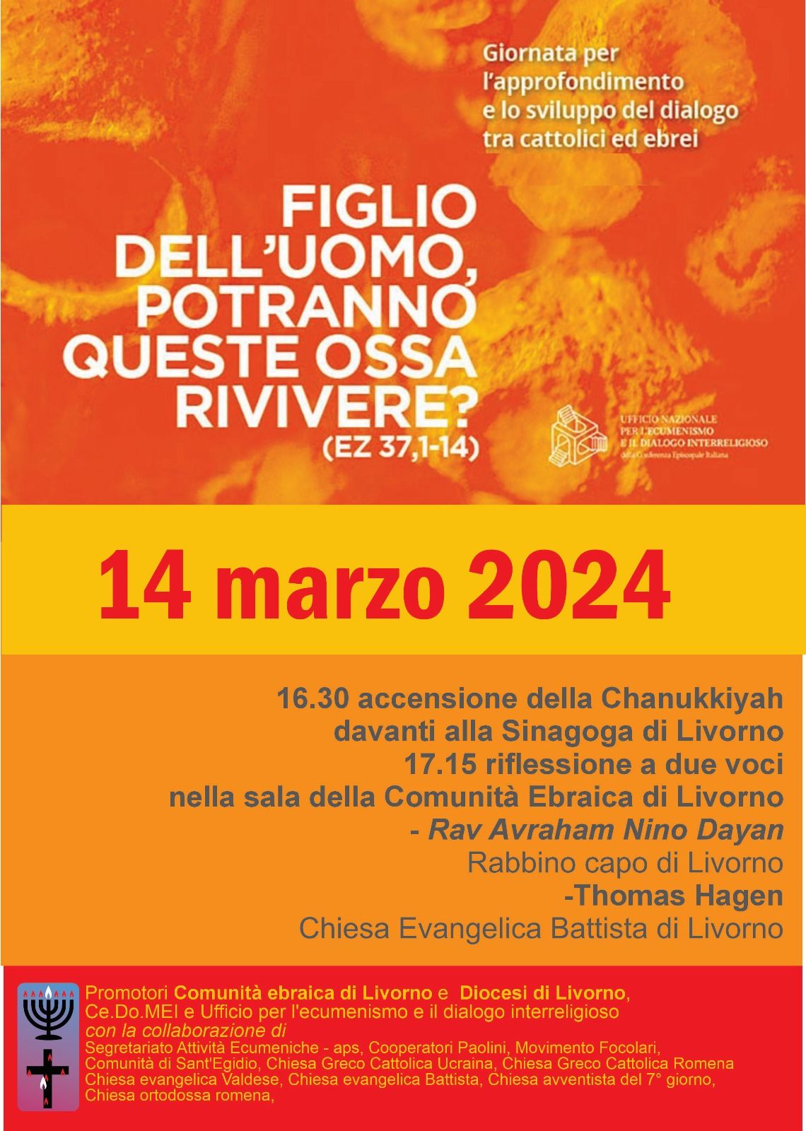 Si celebrerà giovedì 14 marzo la “Giornata del dialogo ebraico cristiano”.Seppur con due mesi di ritardo rispetto alla data ufficiale del 17 gennaio, la volontà oggi più che mai della comunità ebraica di Livorno e delle chiese cristiane della città è quella di onorare questo appuntamento. Alle 16.30 il ritrovo sarà alla Sinagoga per la preghiera e l’accensione della Chanukkyia, mentre alle 17.15 incontro a due voci nella sala della Comunità ebraica di Livorno.Relatori saranno il rabbino capo di Livorno Avraham Nino Dayan e come da tradizione per la parte cristiana, quest’anno è il turno della comunità evangelica battista, con il pastore Thomas Hagen.