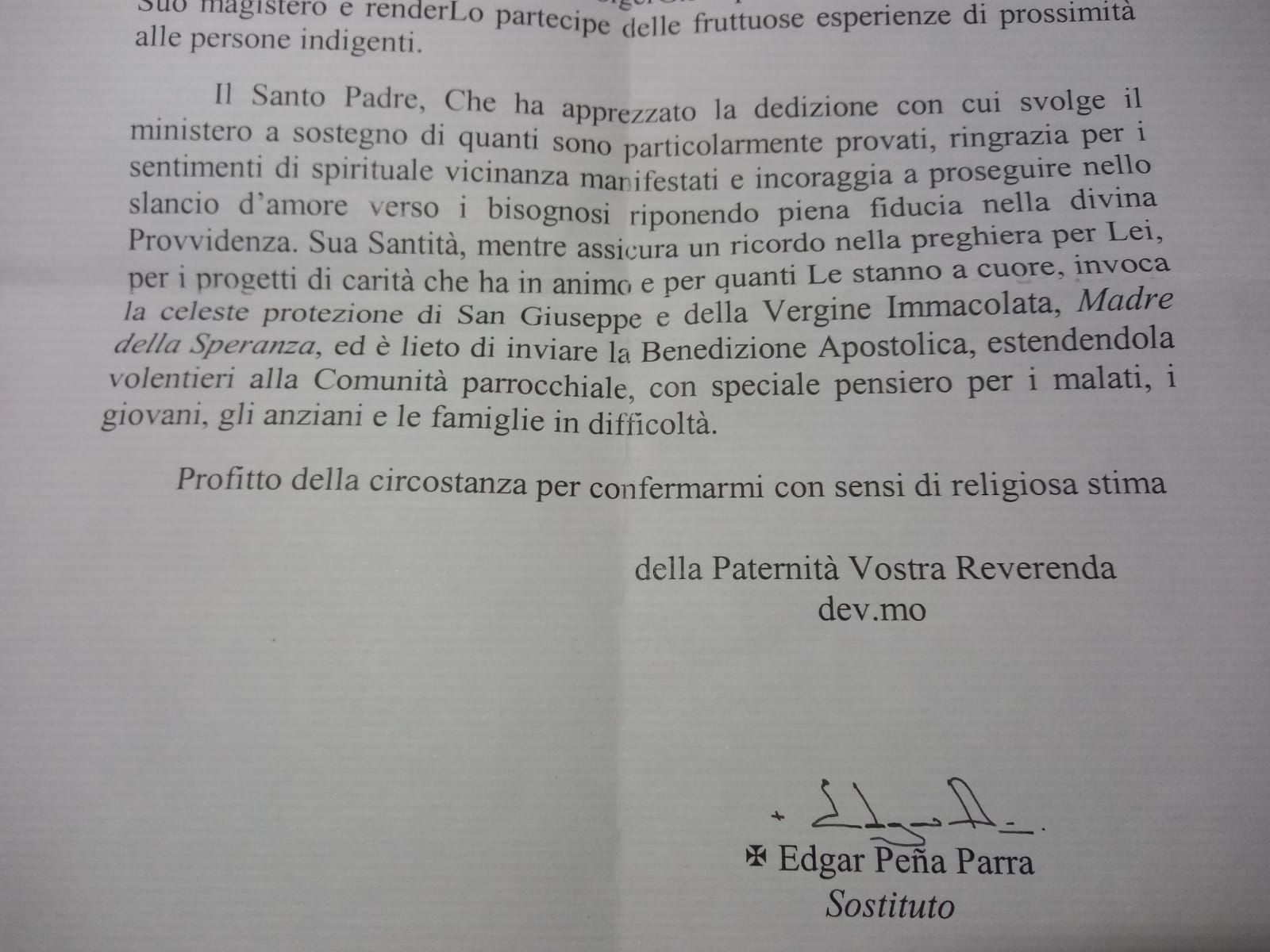 Domenica 2 gennaio, nella parrocchia Santa Rosa, durante la Messa delle 11, abbiamo letto la lettera con la quale Papa Francesco, inviandoci la sua Benedizione Apostolica, esprimeva l’apprezzamento per il servizio reso nell’anno2021, da padre Maurizio De Sanctis e dalla comunità parrocchiale, a sostegno dei più bisognosi e l’invito a proseguire anche quest’anno nella realizzazione di progetti di carità.