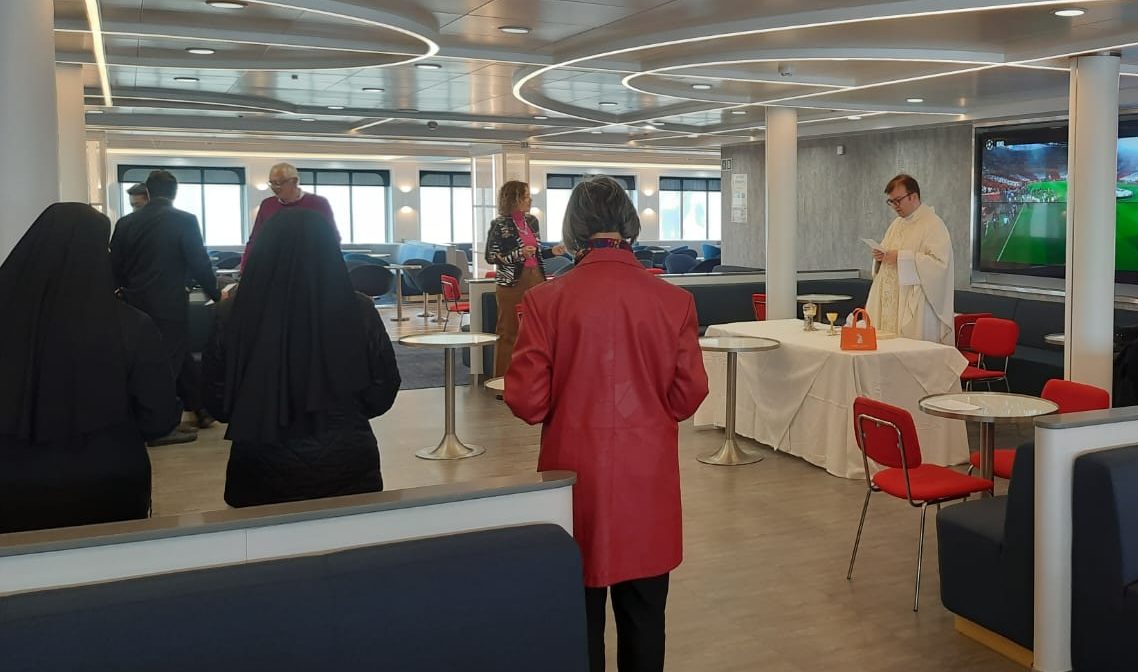 Don Emilio, assistente ecclesiastico dell’Associazione, insieme ad alcuni collaboratori e alle suore Trinitarie, ha portato l’olivo benedetto e le uova a bordo di alcune navi e nella domenica di Pasqua ha celebrato la Messa nel salone del traghetto Moby fantasy; poi, attraverso la radio della Capitaneria di porto, è stata diffusa la liturgia della Parola della Messa di Pasqua a tutte le navi presenti nel porto di Livorno.