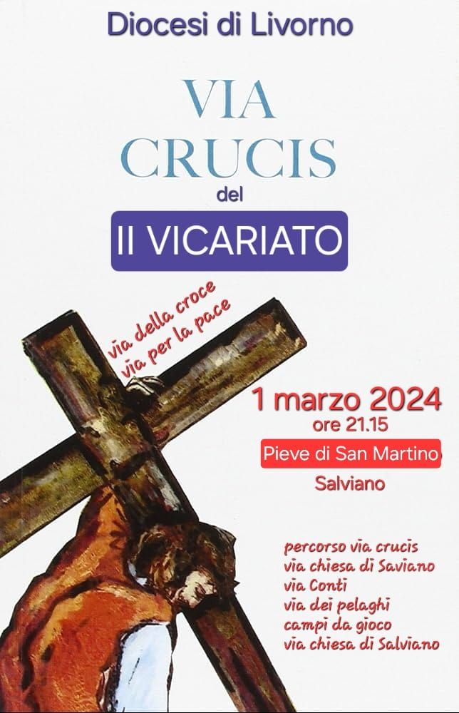 I parroci del 2° vicariato hanno pensato di proporre in questa Quaresima una via Crucis comune per tutti i fedeli delle parrocchie del territorio che comprende: Unità pastorale Tre arcangeli (La Leccia, Salviano, Collinaia); Sacro Cuore Salesiani; S. Giovanni Bosco (Coteto); S. Giovanni Gualberto (Valle Benedetta); S. Teresa di Calcutta (Borgo di Magrignano). Il 1 marzo alle 21.15 inizierà la preghiera insieme, nella chiesa S. Martino in Salviano. Le meditazioni saranno dedicate alla pace, così come ha più volte suggerito il Pontefice; i testi saranno ripresi dai discorsi di papa Francesco. Questa via Crucis per la pace diventerà un appuntamento fisso ogni anno, che le parrocchie del 2° vicariato ospiteranno a rotazione. La partecipazione è naturalmente aperta a tutti.
