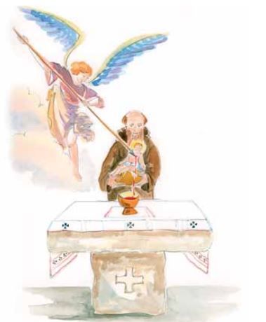 Ma l’anziano così rispose: “Se non accade un fatto a convincermi, non mi persuaderò”. I due padri gli dissero: “In questa settimana pregheremo Dio riguardo a questo mistero, e crediamo che Dio ce lo svelerà”. […] Alla fine della settimana, la domenica, andarono in chiesa e stettero tutti e tre in disparte; il vecchio era in mezzo ai due frati, su un gradino. I loro occhi si aprirono: quando sul santo altare fu posto il pane in sacrificio, loro tre soli videro al suo posto un fanciullo; quando il sacerdote tese la mano per spezzare il pane, ecco scendere dal cielo un angelo del Signore con una spada che immolò il bambino e versò il suo sangue nel calice; quando il sacerdote ruppe il pane in piccoli pezzi, anche l’angelo tagliò dal fanciullo piccoli pezzi e quando si avvicinarono per ricevere i santi doni, al vecchio venne offerta della carne sanguinante. A quella vista egli fu colto da terrore e gridò: “Credo, o Signore, che il pane è il tuo Corpo e il calice il tuo Sangue!”. Subito la carne che aveva in mano assunse le apparenze del pane, secondo il mistero, ed egli si comunicò ringraziando Dio