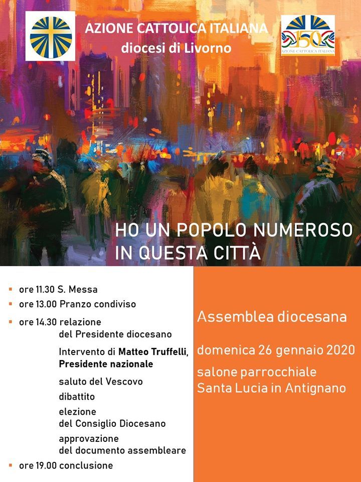 In occasione del rinnovo delle cariche diocesane, l’Azione Cattolica di Livorno organizza un momento di confronto e condivisione Domenica 26 presso il salone parrocchiale di Santa Lucia.La giornata avrà inizio alle 11.30 con la celebrazione e, come momento centrale, oltre alle votazioni per il rinnovo del consiglio diocesano, vedrà la presenza del presidente Nazionale Matteo Truffelli.Truffelli è alle fasi conclusive del suo secondo mandato e ci aiuterà a proseguire in maniera adeguata il cammino assembleare iniziato con le assemblee parrocchiali di Dicembre. Insieme a lui analizzeremo il documento diocesano, redatto dal consiglio uscente sulla base delle indicazioni nazionali.Sarà interessante sentire le parole del presidente e capire la visione del centro nazionale.A seguire ci saranno le votazioni per il rinnovo delle cariche. I vari delegati delle parrocchie, insieme al consiglio diocesano uscente, dovranno eleggere i rappresentanti nei vari settori(Adulti, Giovani e ACR). Gli eletti poi proporranno una terna di nomi al Vescovo che sceglierà il presidente Diocesano. Sono passaggi fondamentali per una condivisione delle cariche e delle responsabilità, da sempre un punto forte dell’associazione.Il programma della giornata inizierà alle 11.30 con la Santa Messa e a seguire pranzo condiviso.A seguire relazione del Presidente Nazionale , dibattito e elezione del consiglio diocesano. A conclusione, alle ore 19.00 verranno recitati i vespri.