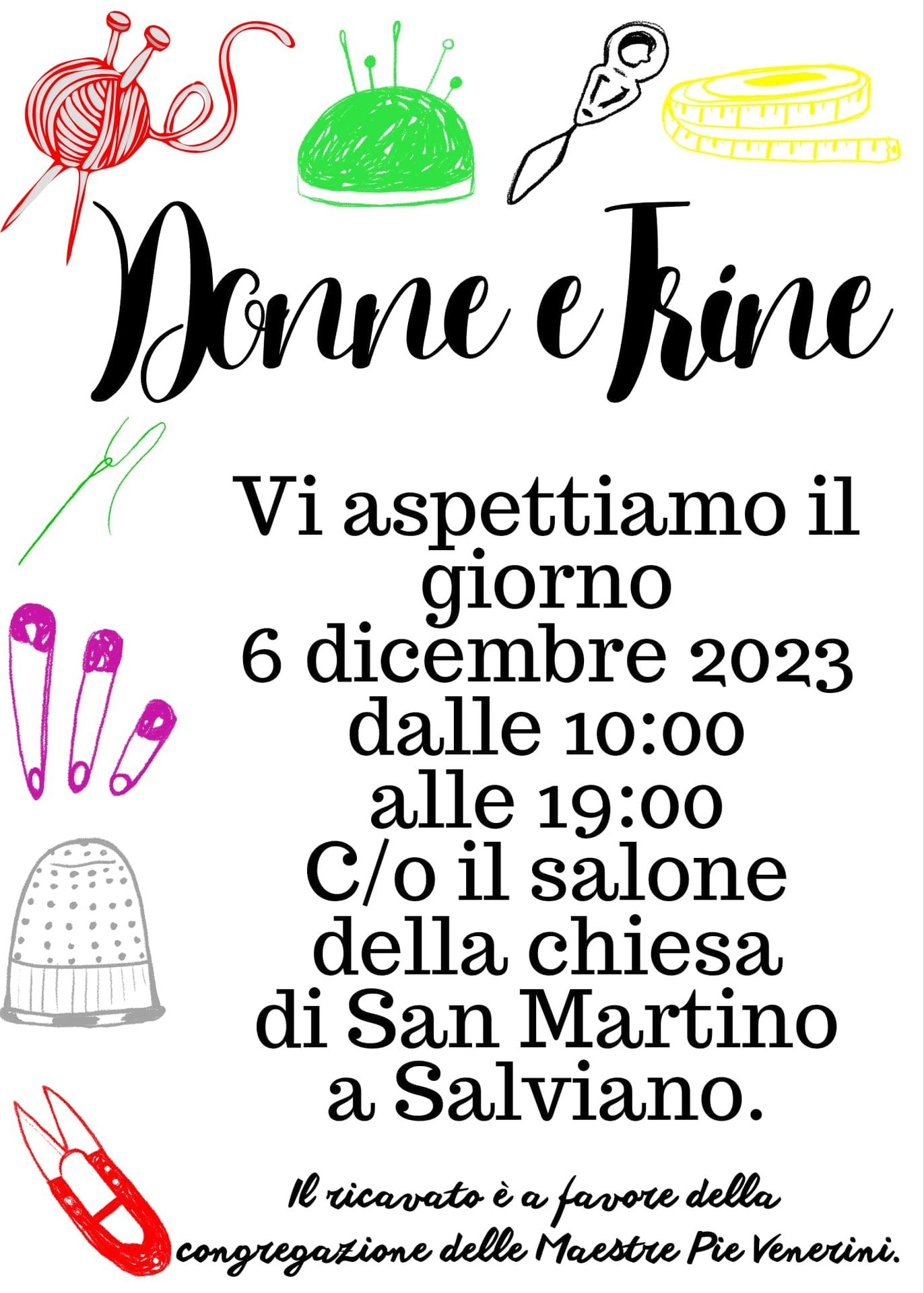 Un appuntamento che si rinnova quello del mercatino di Natale di “Donne e Trine”; tantissime idee regalo per il prossimo Natale realizzate da mani sapienti che saranno messe a disposizione mercoledi 6 dicembre dalle ore 10.00 fino alle 19.00, presso il Salone della Chiesa di S. Martino a Salviano.Il ricavato sarà a favore della congregazione delle Maestre Pie Venerini.