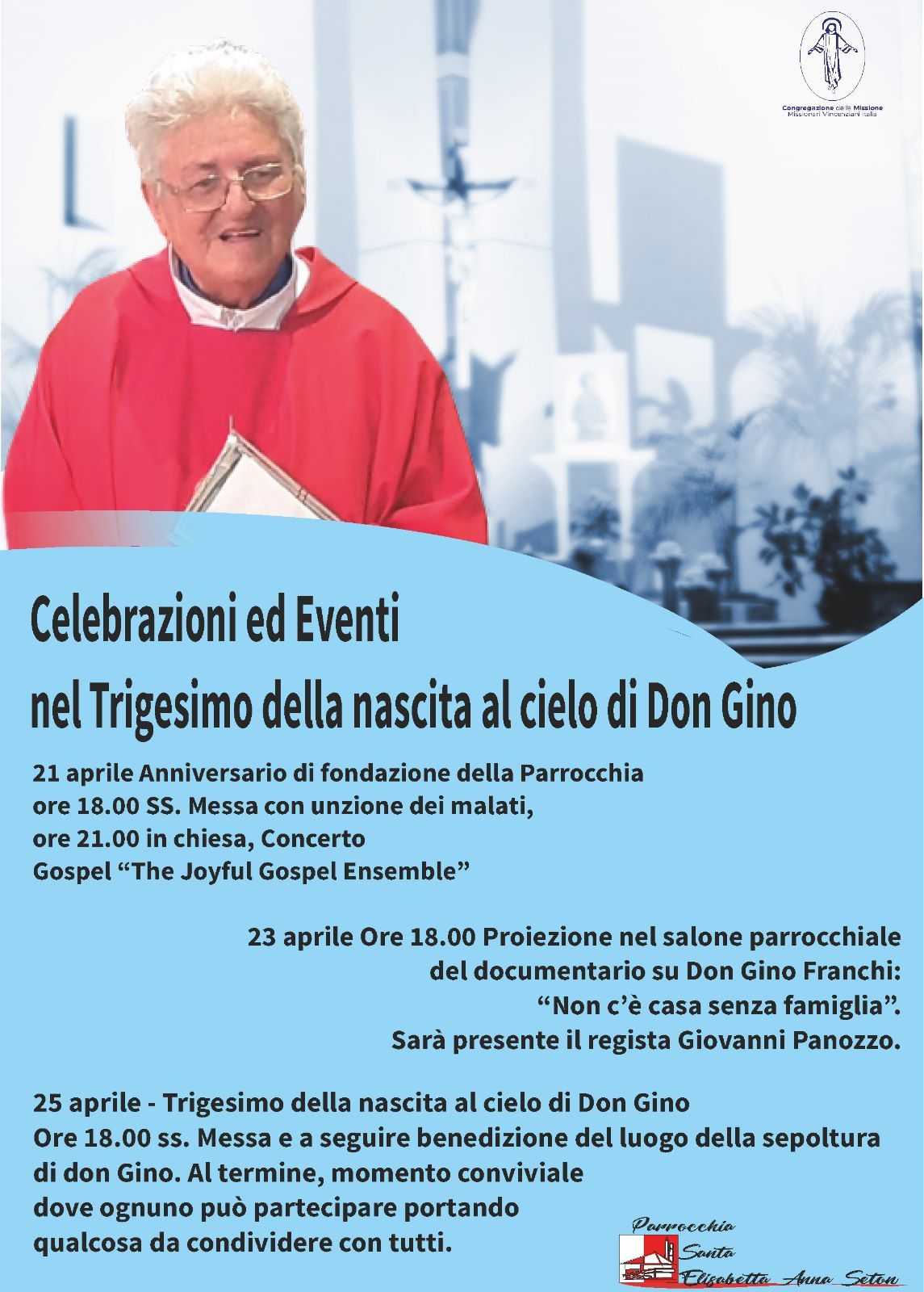 Venerdì 21, in chiesa, il coro Joyful gospel ensamble, offrirà un concerto in memoria del sacerdote; Domenica 23 aprile alle 18 sarà invece proiettato il docufilm realizzato dal regista Giovanni Panozzo sulla storia della chiesa, con l’intervista a don Gino Franchi; infine Martedì 25 aprile, alle 18 la Messa per il trigesimo e al termine una semplice cerimonia, nella quale sarà benedetto il luogo dove saranno poste le ceneri di don Gino, nel giardino della chiesa, accanto a quelle dei fratelli Filicchi.