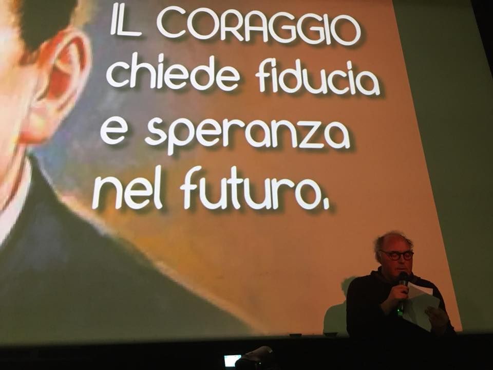 Le nostre paure i nostri buchi neri i nostri vuoti di aria …Queste parole del testo della canzone il Peso del Coraggio aprono la seratae  rappresentano probabilmente le sensazioni e i sentimenti delle molte persone che gremiscono il Teatro dei Salesiani. Sullo schermo, la proiezione  del volto di un uomo : è il volto di un  prete . Un bel  volto, rassicurante, sorridente: è il volto di Don Giovanni battista Quilici che Don Luigi, chiamerà nel corso della serata, semplicemente, Giovanni