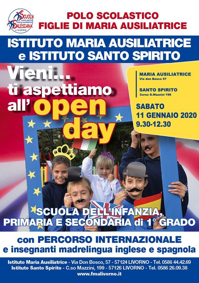 L’Istituto Maria Ausiliatrice e l’Istituto Santo Spirito aprono le porte a quanti desiderano conoscere la loro proposta con una mattinata di Open Day sabato 11 gennaio 2020 dalle 9.30 alle 12.30; un’attenzione speciale è rivolta a chi desidera cercare un luogo sicuro e carico di valori educativi per iscrivere i propri figli al primo anno di Scuola dell’Infanzia o Primaria o Secondaria di primo grado.