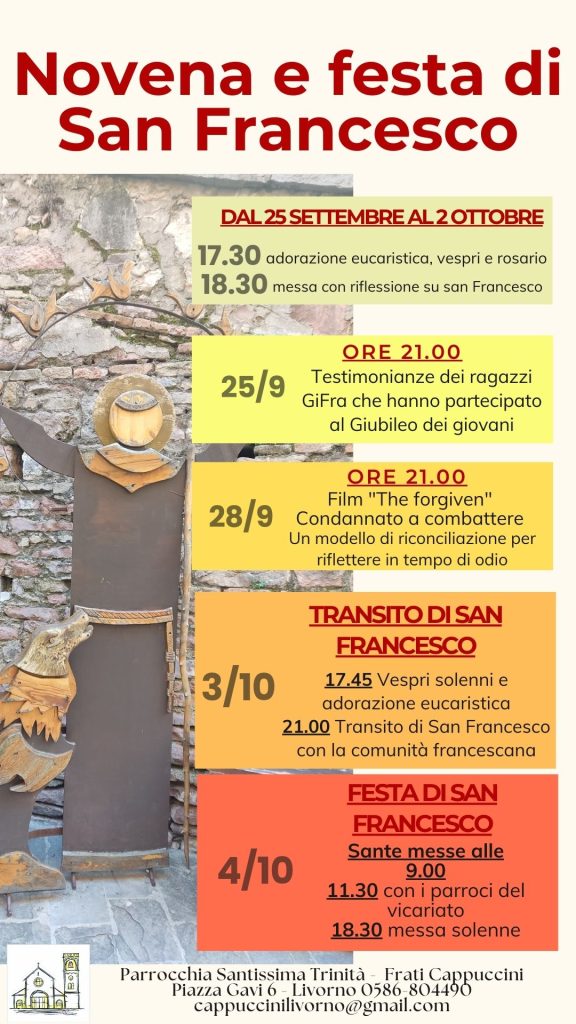Dal 25 settembre al 4 ottobre la Parrocchia della Santissima Trinità dei Frati Cappuccini di Livorno ospiterà un intenso programma di celebrazioni e incontri in occasione della Novena e Festa di San Francesco, patrono d’Italia.
