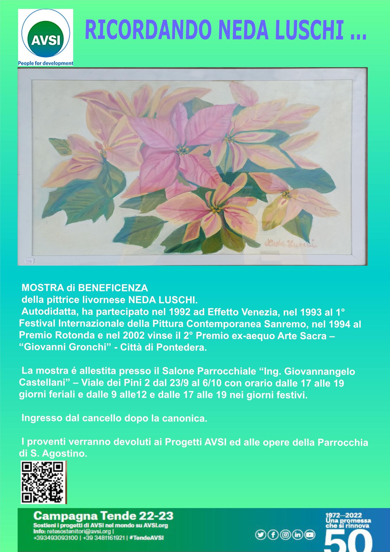 La Fondazione AVSI – Livorno, una ONLUS che realizza progetti di cooperazione allo sviluppo e aiuto umanitario in 40 paesi inclusa l’Italia, in collaborazione con la Parrocchia di S. Agostino, promuove una Mostra di Beneficenza delle opere della pittrice livornese Neda Luschi (sorella del pittore Nedo Luschi).
