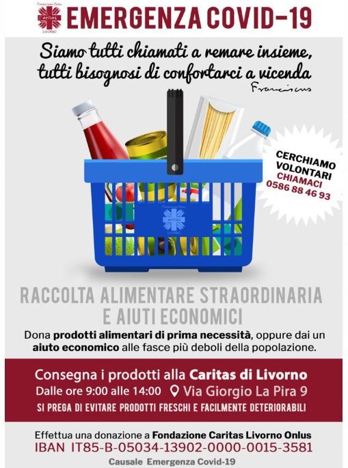 Una raccolta straordinaria di generi alimentari, ma anche un aiuto economico per tutti coloro che in questi giorni di emergenza si trovano in difficoltà, è questa la nuova iniziativa lanciata da Caritas Livorno. Un’attenzione particolare a chi non riesce neppure a fare la spesa. E Caritas cerca anche volontari: chiama lo 0586 884693!