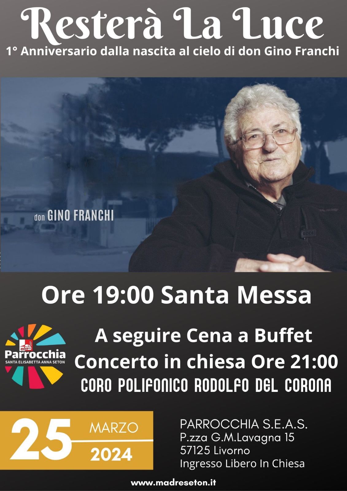 In occasione del primo anniversario dalla nascita al cielo di don Gino Franchi, il prossimo 25 marzo, la parrocchia di s. Elisabetta Anna Seton organizza per il suo ricordo una serata di preghiera e musica,  con la ss. messa alle ore 19.00, una cena a buffet nel teatro e a seguire alle ore 21.00 un concerto in chiesa (ingresso libero) che vedrà la partecipazione del Coro Polifonico Rodolfo del Corona, con il direttore Luca Stornello e gli strumentisti Giovanna Pieri Buti e Eleonora Mugnaini (Violino), Marta degl’Innocenti (viola), Elisabetta Casapieri (Violoncello), Michele Roffi (Contrabbasso).