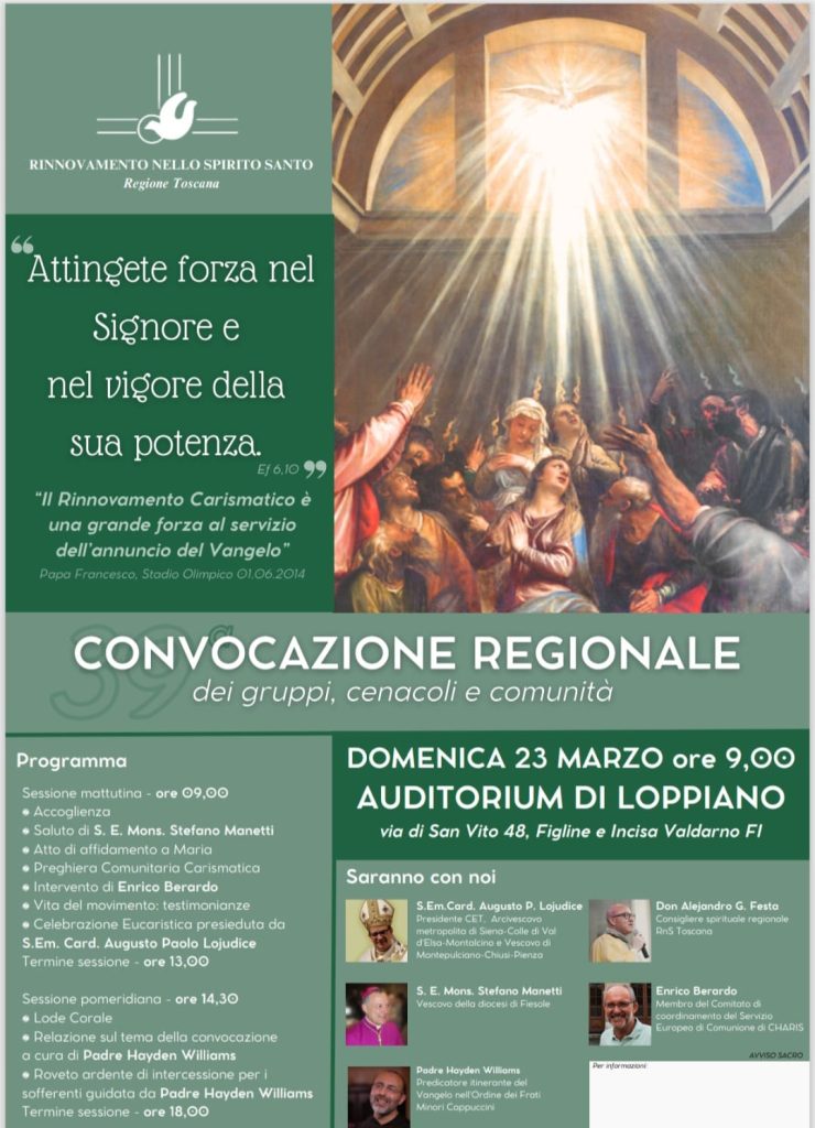 Ma il mese di marzo si presenta ricco di eventi per il Rinnovamento nello Spirito; il 23 marzo sarà presente al convegno regionale a Loppiano: una giornata insieme a tutti i fratelli e sorelle dei cenacoli, Gruppi e Comunità di tutta la Toscana, sarà presente il Cardinale Lojudice il vescovo di Fiesole e nel pomeriggio spazio alla preghiera carismatica animata da padre Hayden, discepolo di padre Cantalamessa, evangelizzatore itinerante con preghiera di intercessione.
