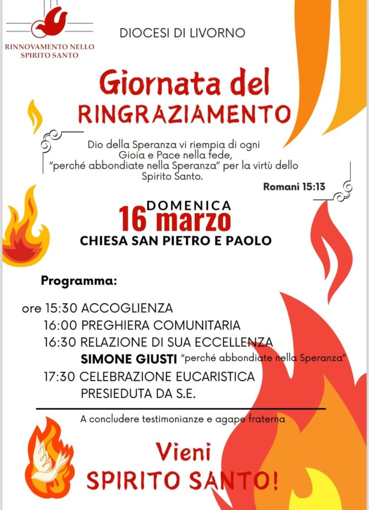 Domenica 16 il Rinnovamento nello Spirito Santo a livello nazionale celebra la “Giornata del ringraziamento”, cioè l’anniversario dell’approvazione dello statuto avvenuto il 14 marzo 2002 e come ogni diocesi d’Italia anche nella diocesi di Livorno il gruppo del Rinnovamento ha invitato il proprio Vescovo a trascorrere un momento di preghiera e riflessione insieme.