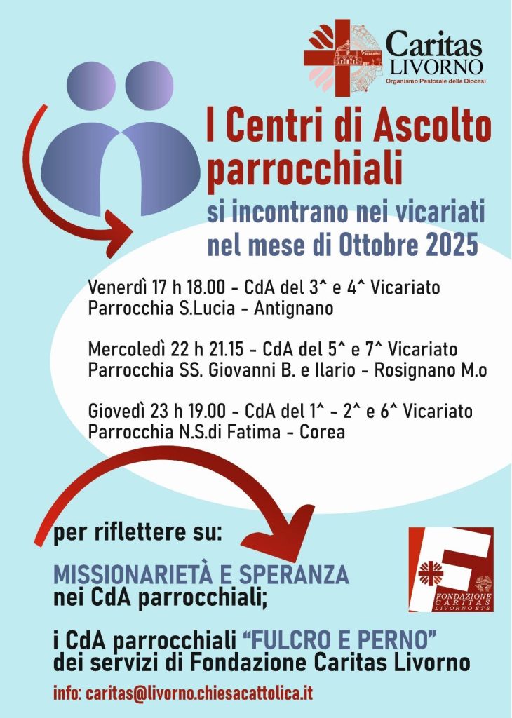 Nel mese di ottobre i Centri di Ascolto parrocchiali della diocesi di Livorno si riuniscono nei diversi vicariati per un ciclo di incontri dedicati alla riflessione e al confronto sul ruolo della missionarietà e della speranza nelle comunità locali.