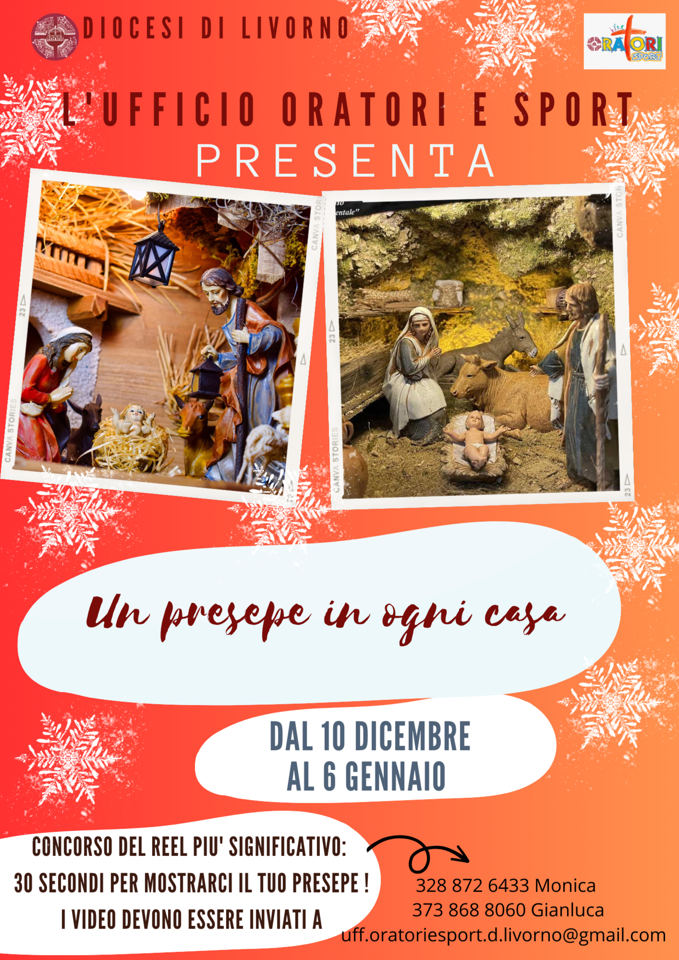 “Un Presepe in ogni casa”: è questa l’iniziativa lanciata dalla CEI, nell’800° anniversario del primo presepe allestito a Greccio da S. Francesco d’assisi. E per promuovere la realizzazione dei presepi in famiglia, l’ufficio l’Ufficio Oratori e Sport della Diocesi ha indetto un concorso. L’iniziativa rivolta soprattutto ai più giovani vede l’invio di un breve video che racconti il proprio presepe. I reel più originali e significativi saranno premiati dalla commissione incaricata. Per informazioni rivolgersi a Monica 328 8726433 oppure a Gianluca 373 8688060