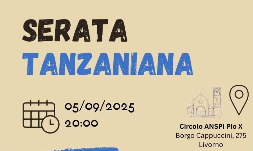 Il prossimo 5 settembre 2025, alle ore 20:00, il Circolo ANSPI Pio X di Livorno (Borgo Cappuccini, 275) ospiterà la Serata Tanzaniana, un evento speciale che unisce gastronomia, musica e solidarietà.