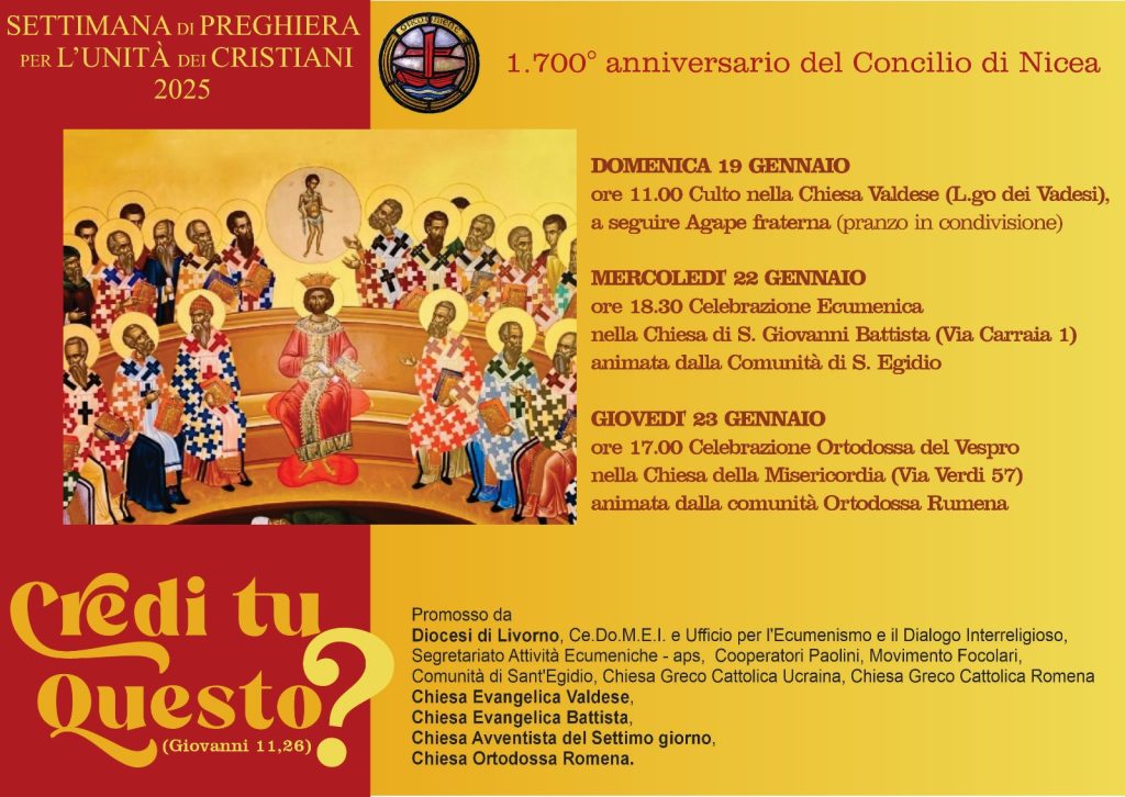 Si aprirà domani 18 gennaio, la settimana di preghiera per l’unità dei cristiani. Ogni anno anche a Livorno sono diverse le iniziative in calendario, in collaborazione con le chiese cristiane presenti sul territorio: domenica 19 alle 11 culto ecumenico nella chiesa Valdese in largo dei Valdesi e a seguire pranzo in condivisione; mercoledì 22 gennaio alle 18.30 nella chiesa S. Giovanni Battista celebrazione ecumenica, animata dalla Comunità S. Egidio; giovedì 23 alle 17 nella chiesa della Misericordia in via Verdi vespro ecumenico a cura della comunità ortodossa rumena.