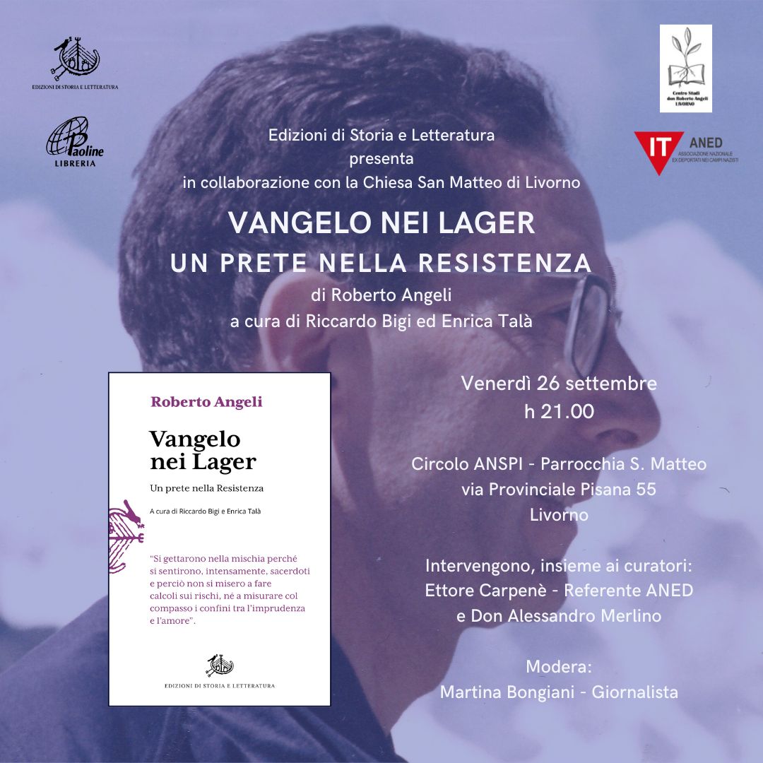 Nell’ambito dei festeggiamenti in onore di San Matteo, venerdì 26 settembre, alle ore 21.00, presso il Circolo ANSPI della Parrocchia San Matteo (via Provinciale Pisana 55, Livorno), si terrà la presentazione del libro “Vangelo nei Lager – Un prete nella Resistenza”, scritto da Roberto Angeli e curato da Riccardo Bigi ed Enrica Talà.