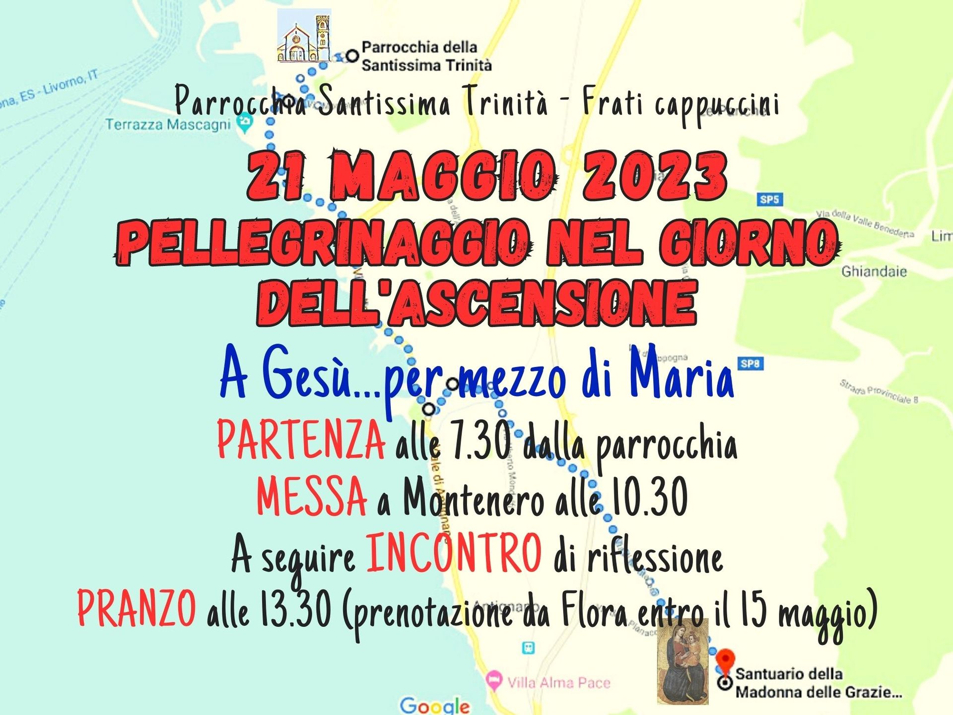 “A Gesù, per mezzo di Maria”: torna il pellegrinaggio annuale al Santuario di Montenero della parrocchia della Ss. Trinità-Cappuccini. Come ogni anno nella domenica dell’ascensione la comunità di piazza Gavi si recherà a Montenero per una giornata di cammino, preghiera e fraternità. L’iniziativa naturalmente è aperta a tutti.
