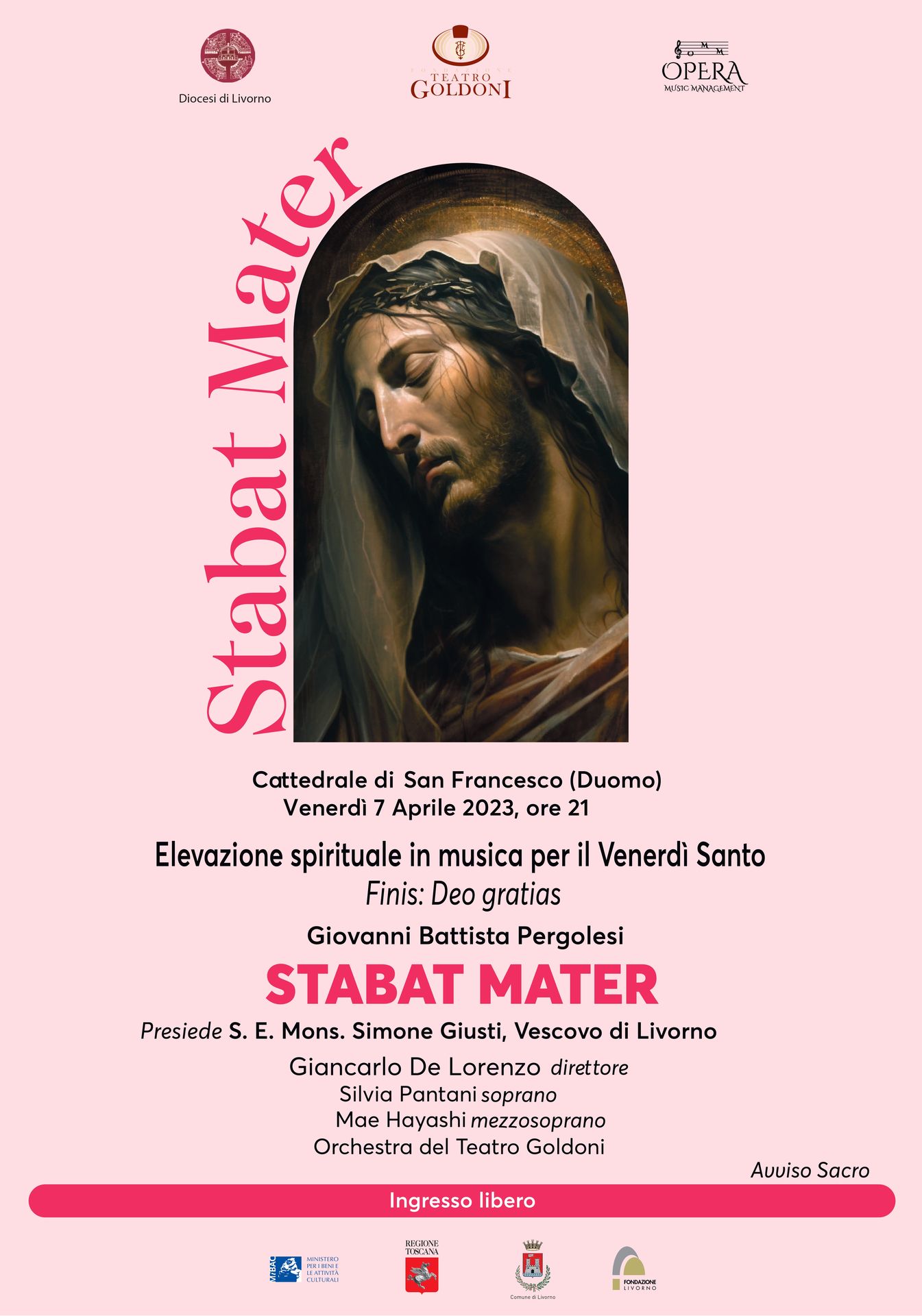 Sarà il Vescovo monsignor Simone Giusti a presiedere venerdì 7 aprile, alle ore 21 nella Cattedrale di San Francesco (Duomo), l’Elevazione Spirituale per il Venerdì Santo che prevede l’esecuzione dello Stabat Mater di Giovanni Battista Pergolesi a cura dell’Orchestra e Coro del Teatro Goldoni diretti da Giancarlo De Lorenzo, con Silvia Pantani soprano e Mae Hayashi mezzosoprano.